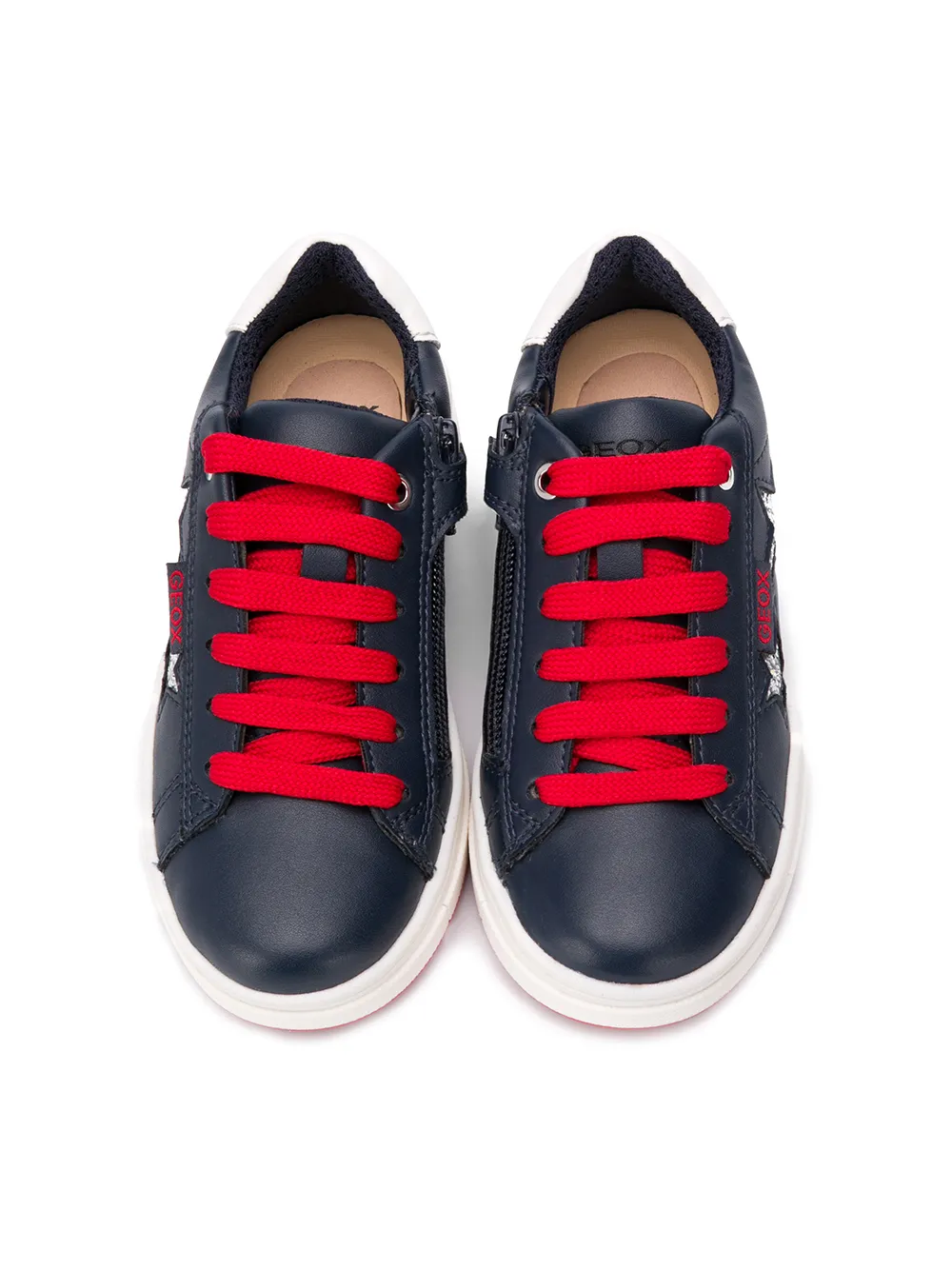 Кеды на шнуровке от Geox Kids. Закругленный носок, шнуровка спереди, язычок с логотипом, фирменная стелька, ярлык с логотипом, детали с блестками и резиновая подошва.