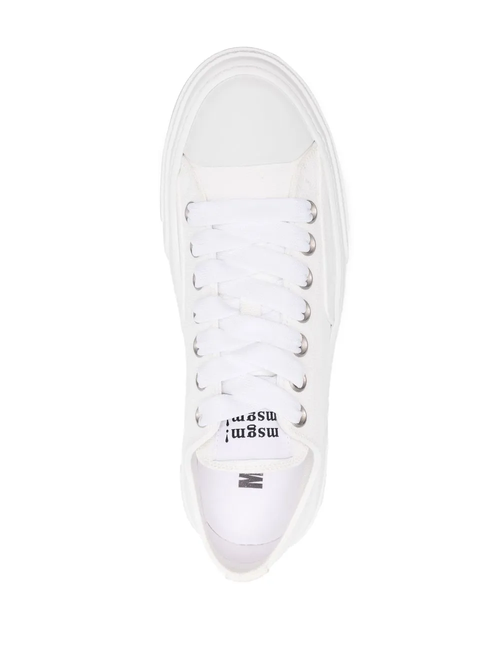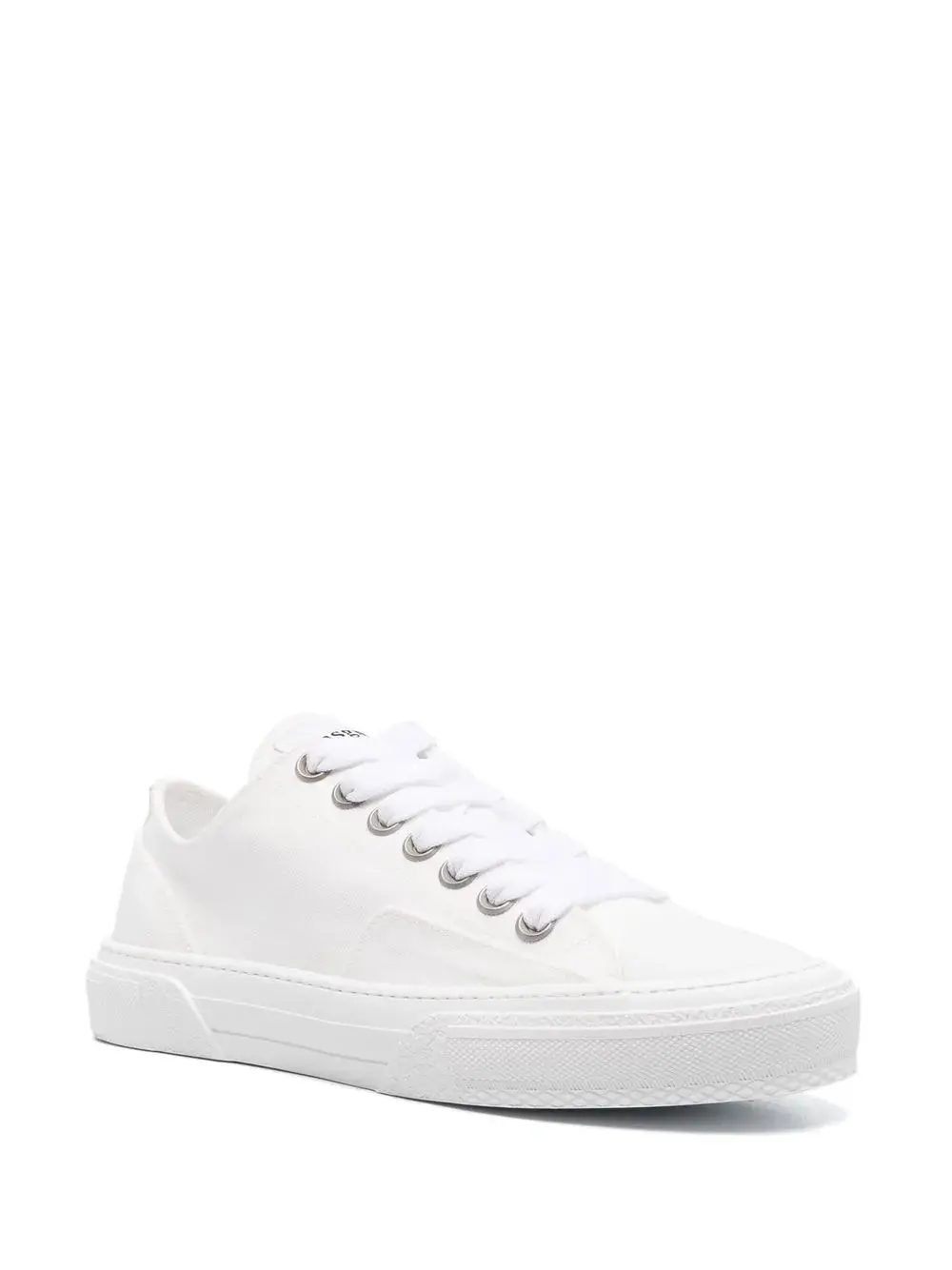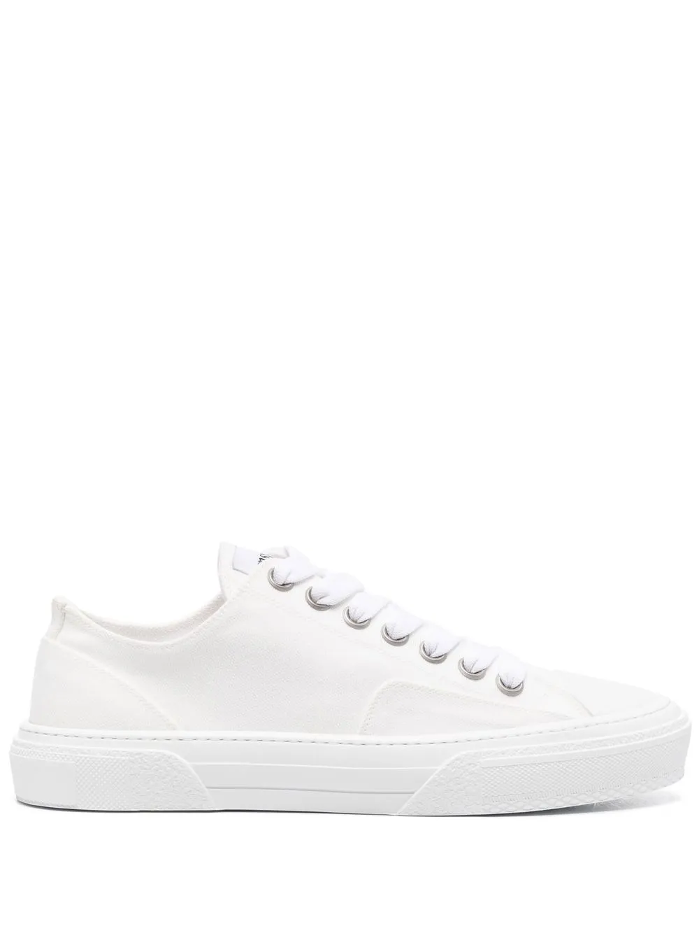 Белый, язычок с логотипом, стелька с логотипом, закругленный носок, шнуровка спереди и плоская резиновая подошва.