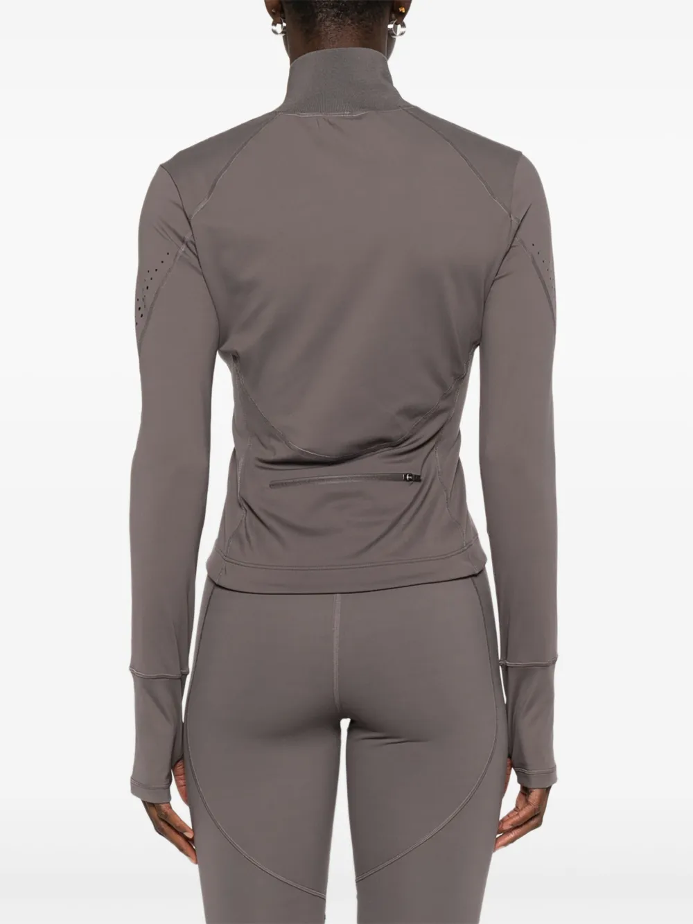 Серая застежка-молния, вырезанные лазером панели, высокий ворот, длинные рукава.