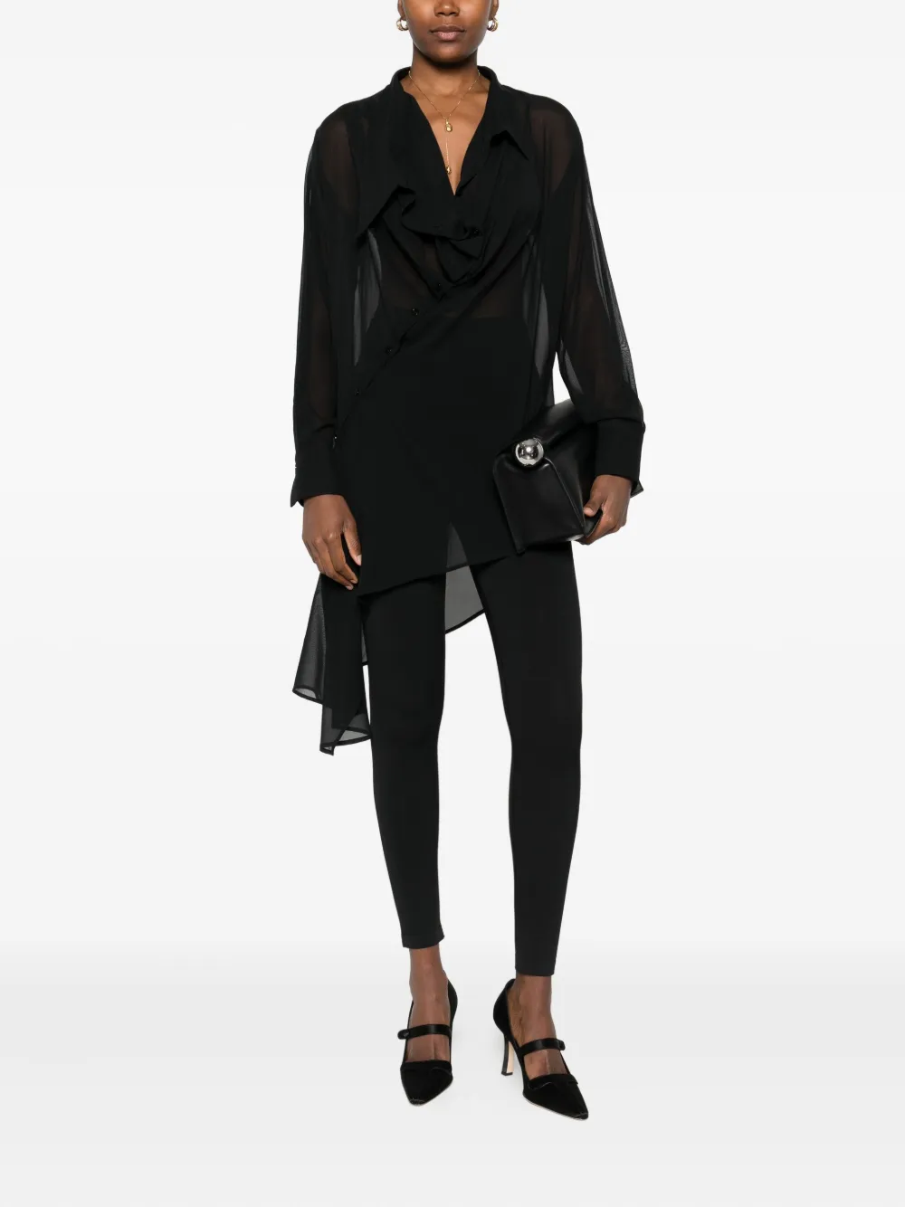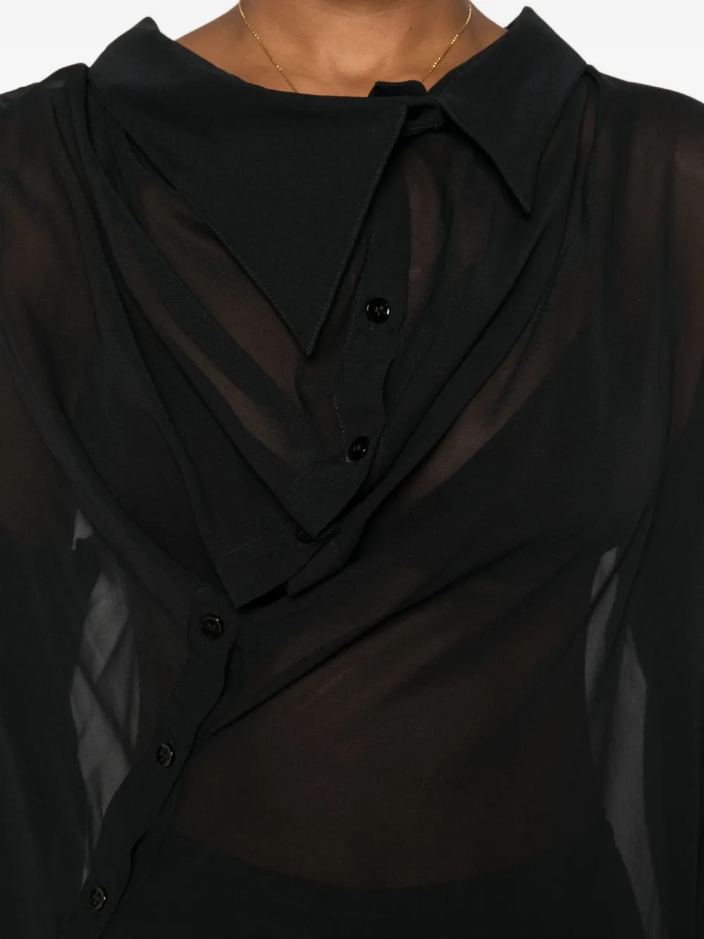 Черный асимметричный подол, драпированный вырез, асимметричная застежка на пуговицы, длинные рукава.