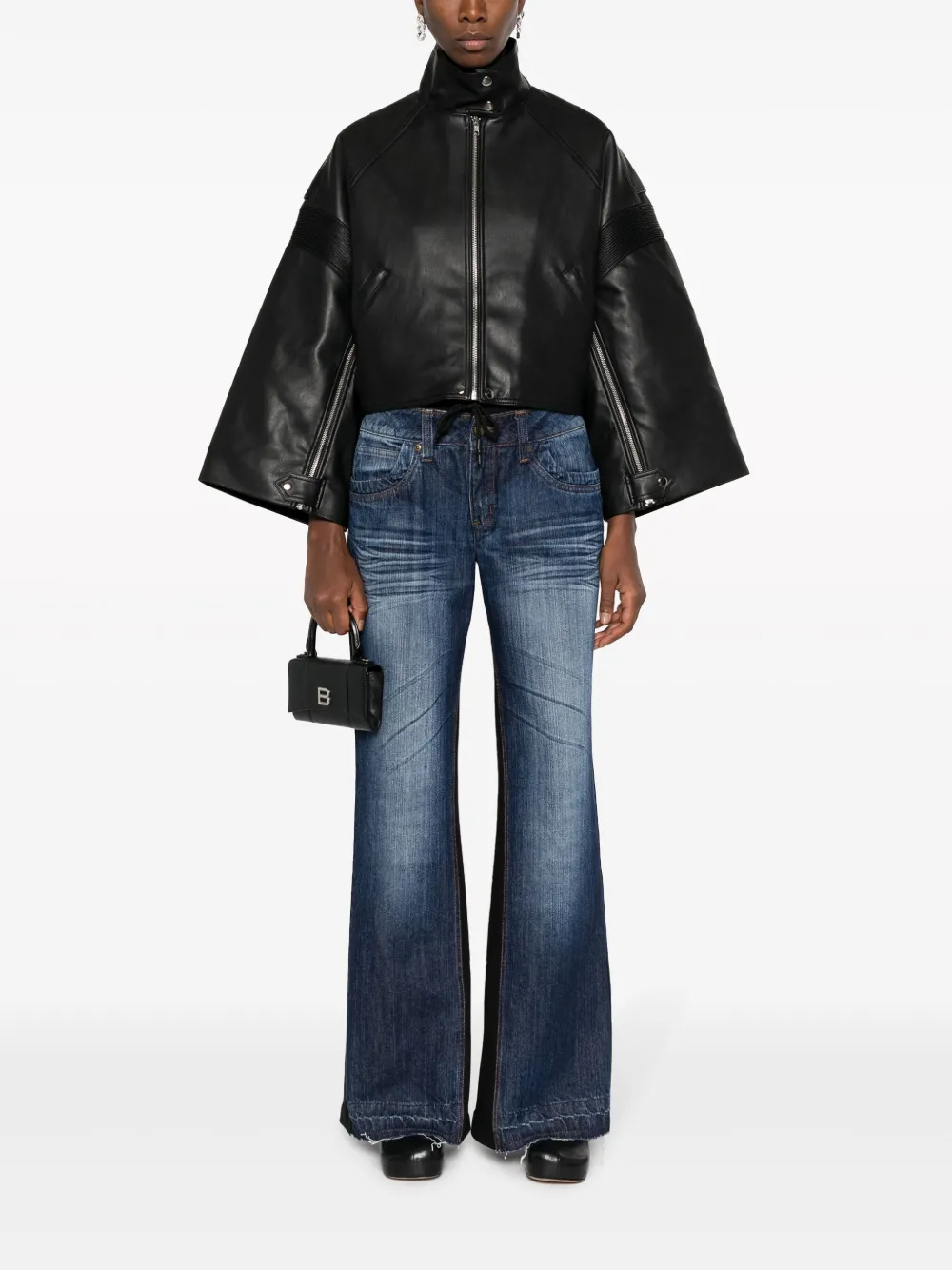Синий, черный, эластичный хлопок, эффект потертости, многослойный эффект, деним в технике пэчворк, стиль колор-блок, декоративные складки, петли для ремня, застежка на молнии и пуговице спереди, широкий крой, пять карманов и необработанные края.