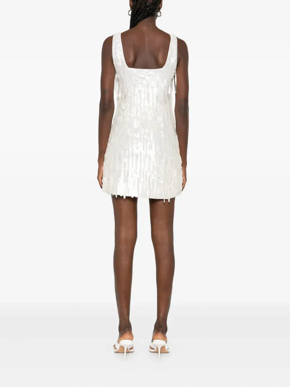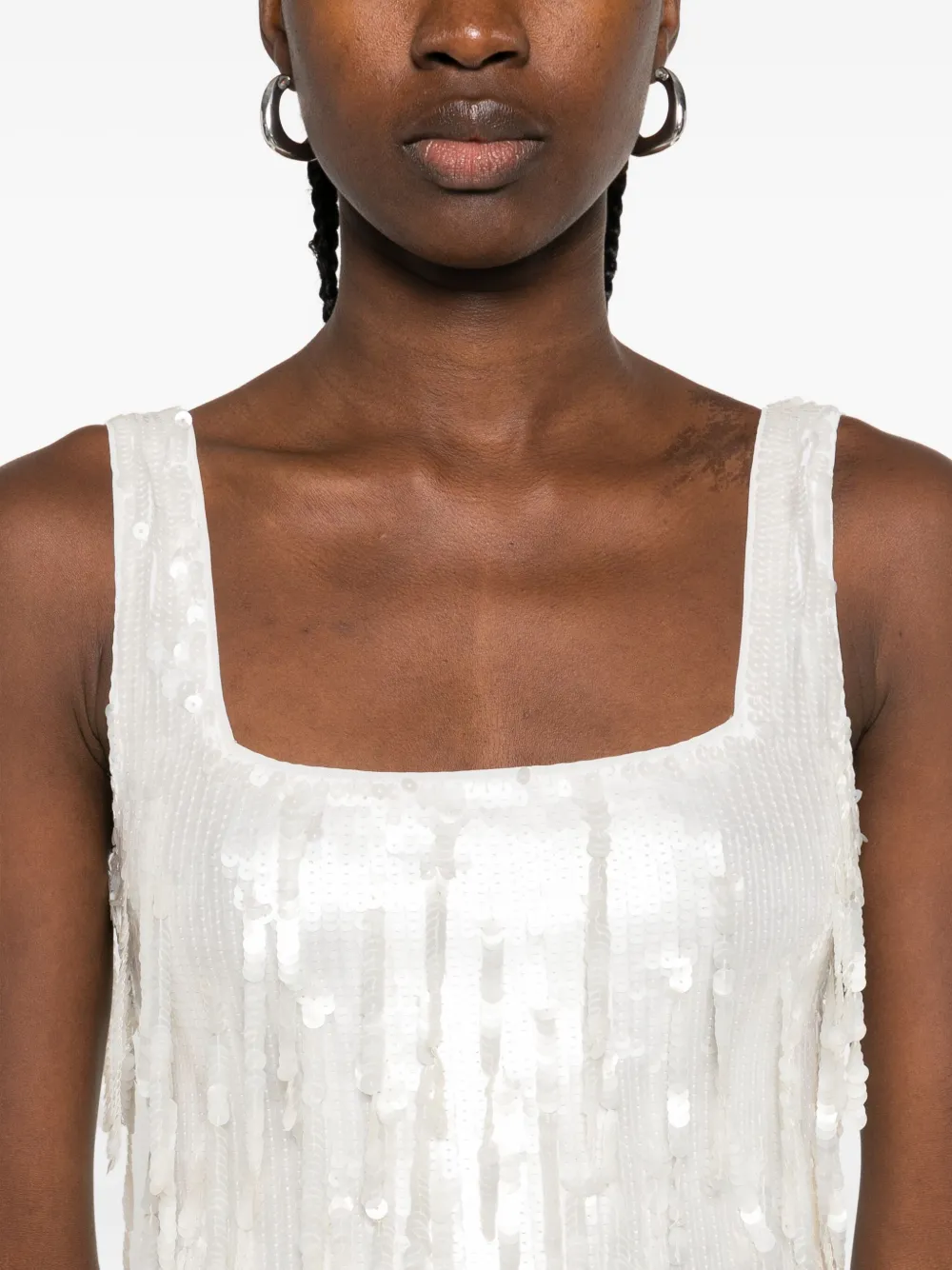 Платье без рукавов с квадратным вырезом и прямым подолом, украшенное белыми пайетками.