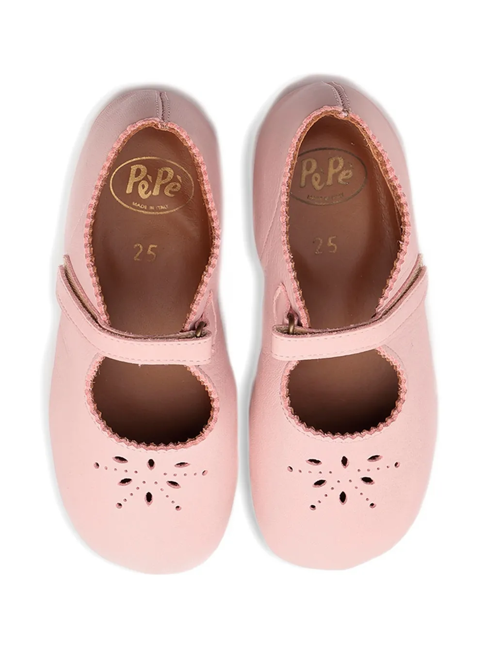 Розовая телячья кожа, фестончатая отделка, перфорированные детали, ремешок на липучке, плоская подошва