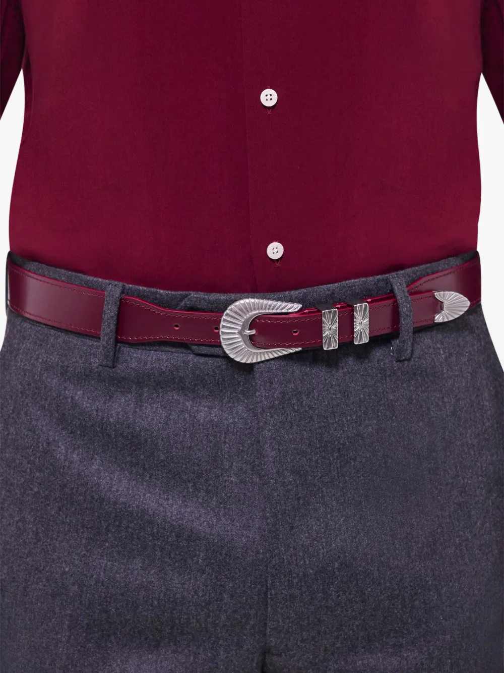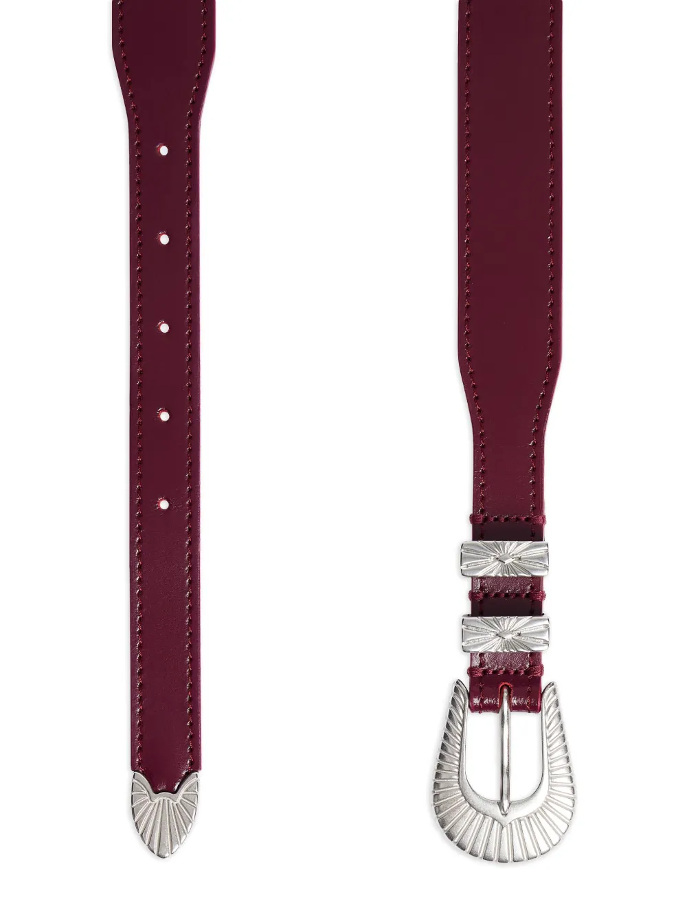Декоративная пряжка красного серебристого тона с заостренными кончиками ремня, пятью отверстиями.