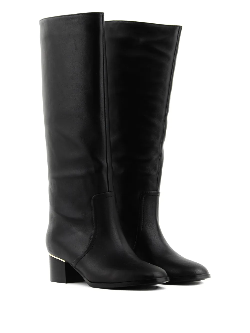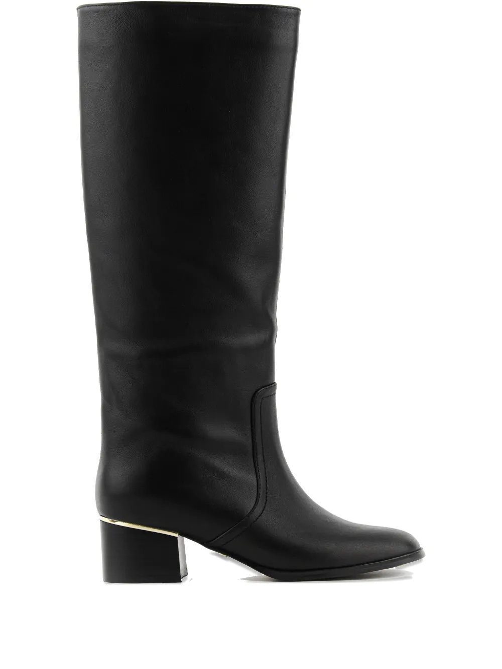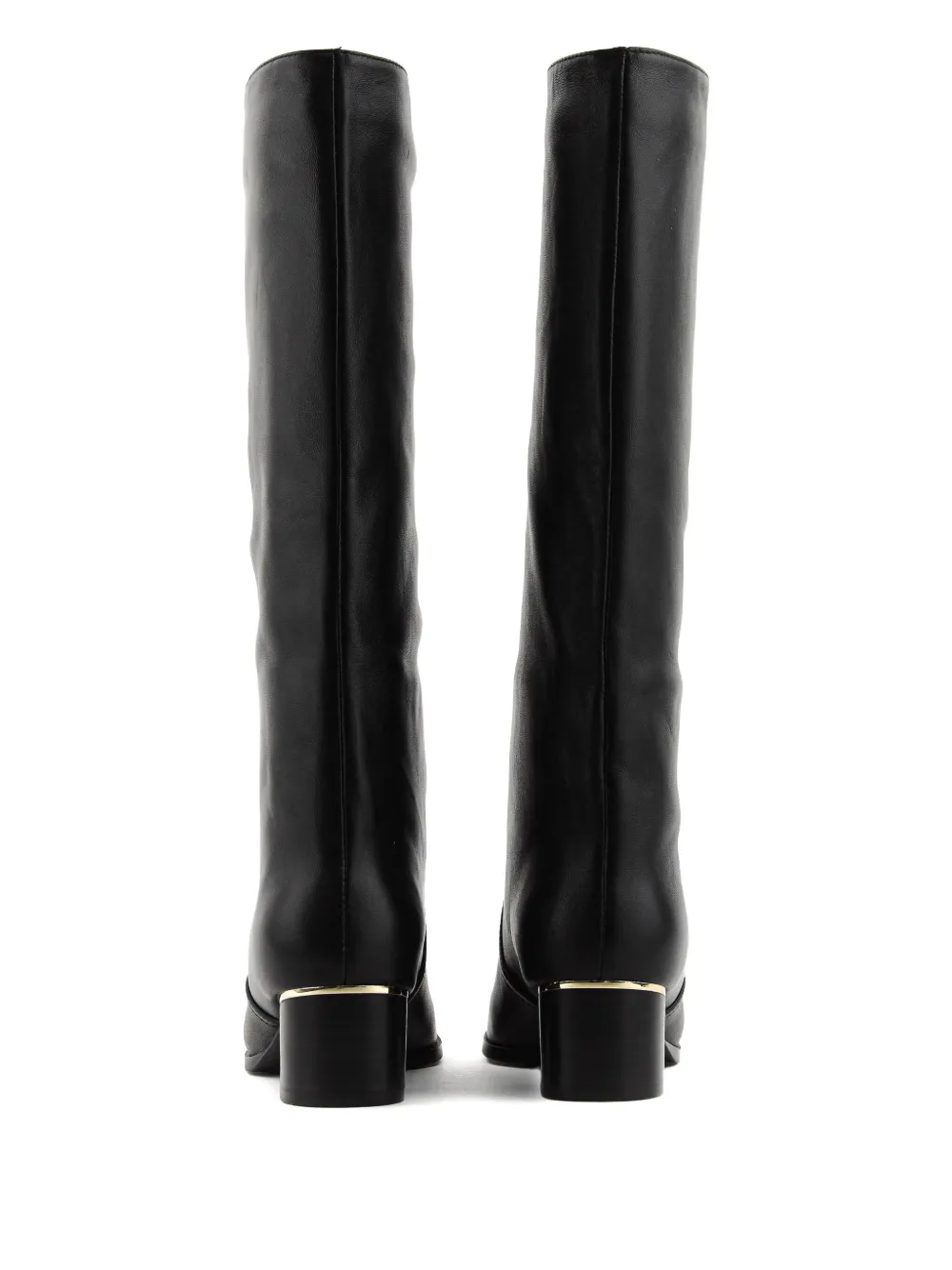 Верх из черной телячьей кожи, золотистая отделка каблука, блочный каблук, закругленный носок, голенище до колена
