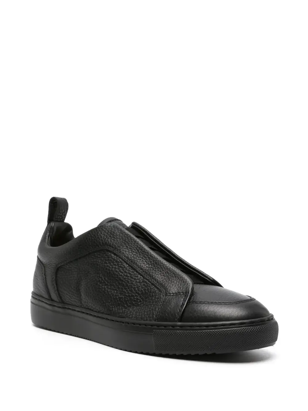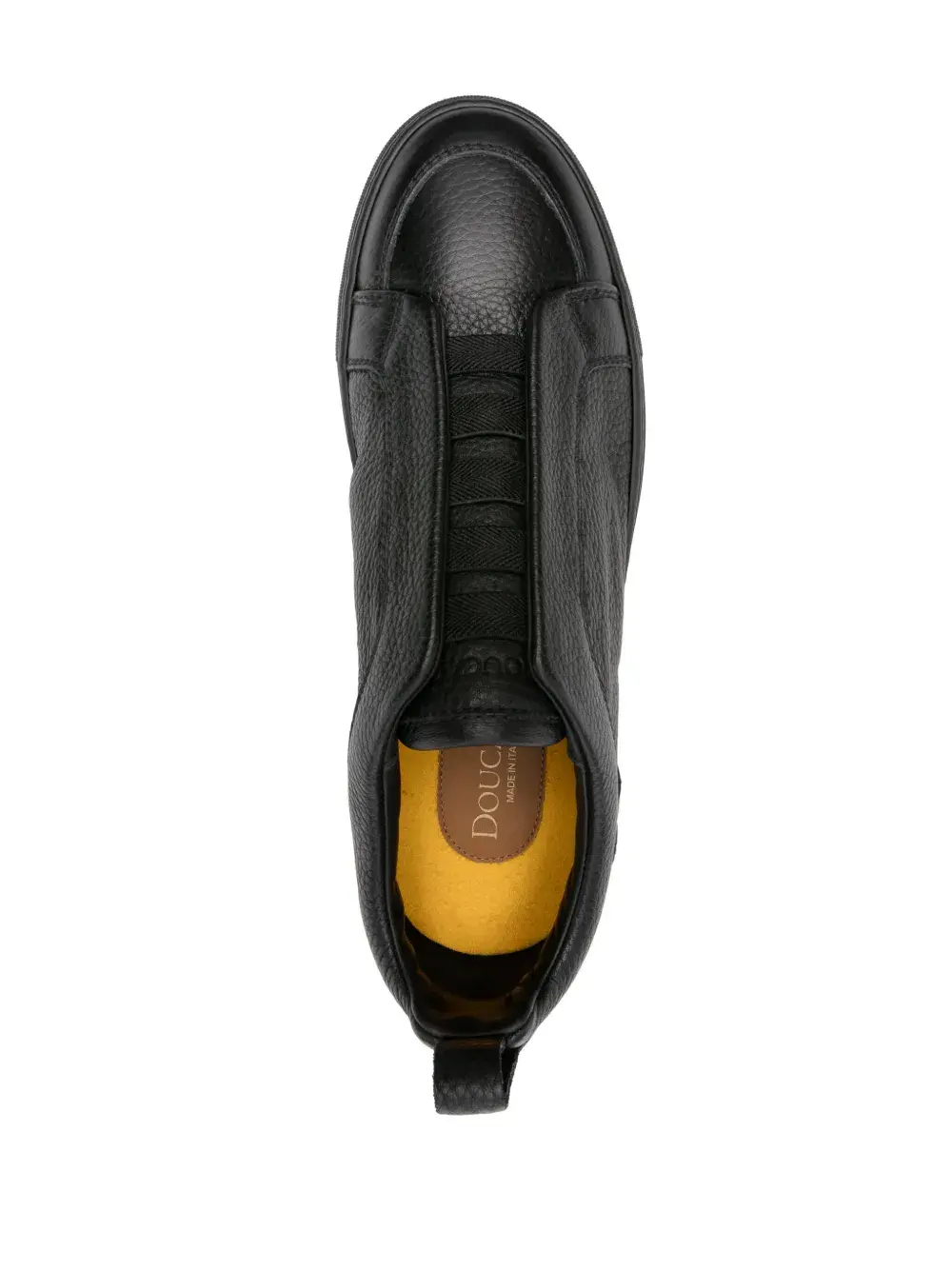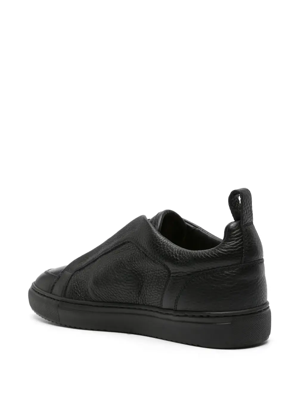 Черный, телячья кожа, зернистая текстура, тисненый логотип на язычке, закругленный носок, модель без застежки, петля для подтягивания сзади, стелька с логотипом и плоская резиновая подошва.