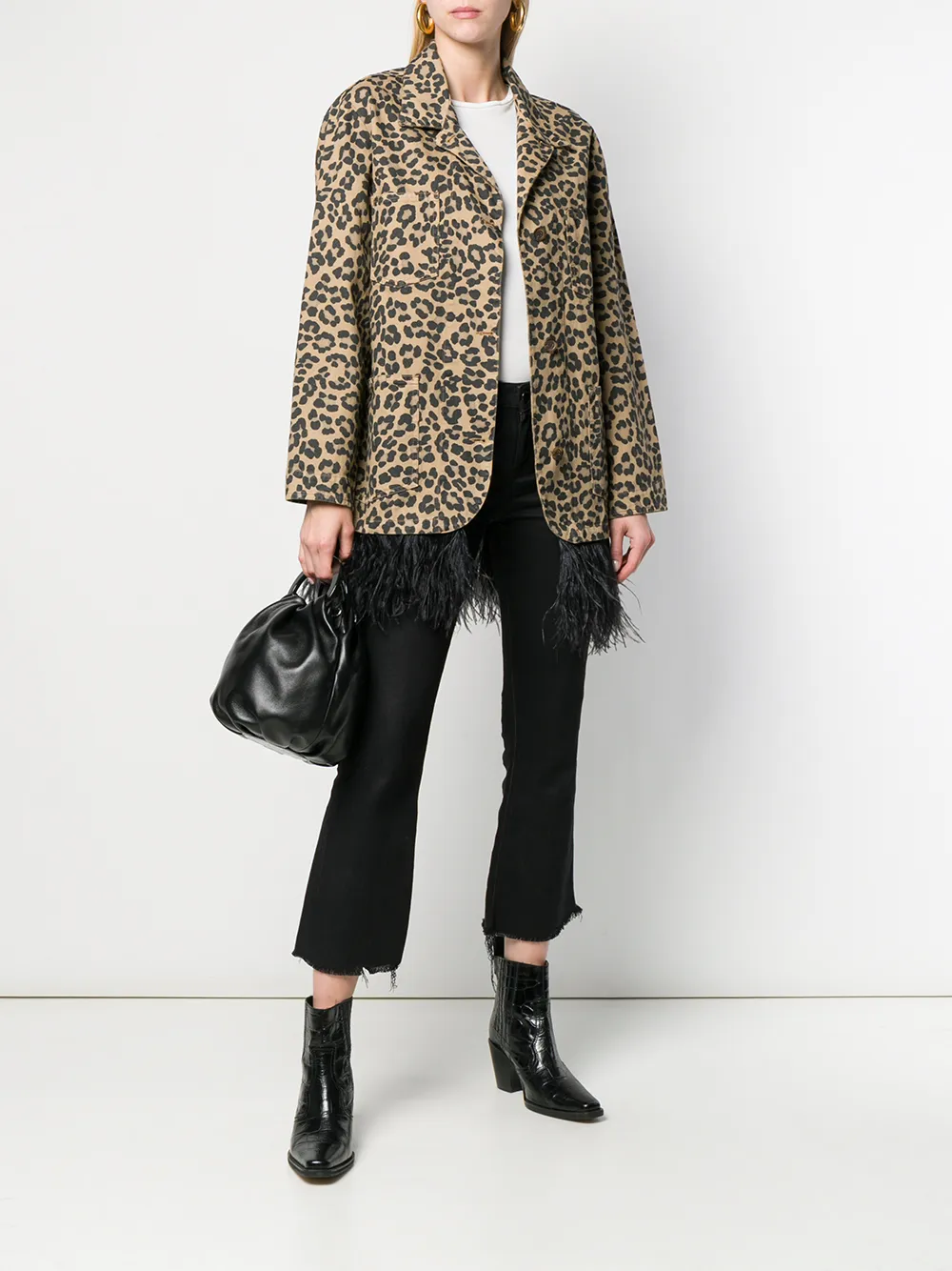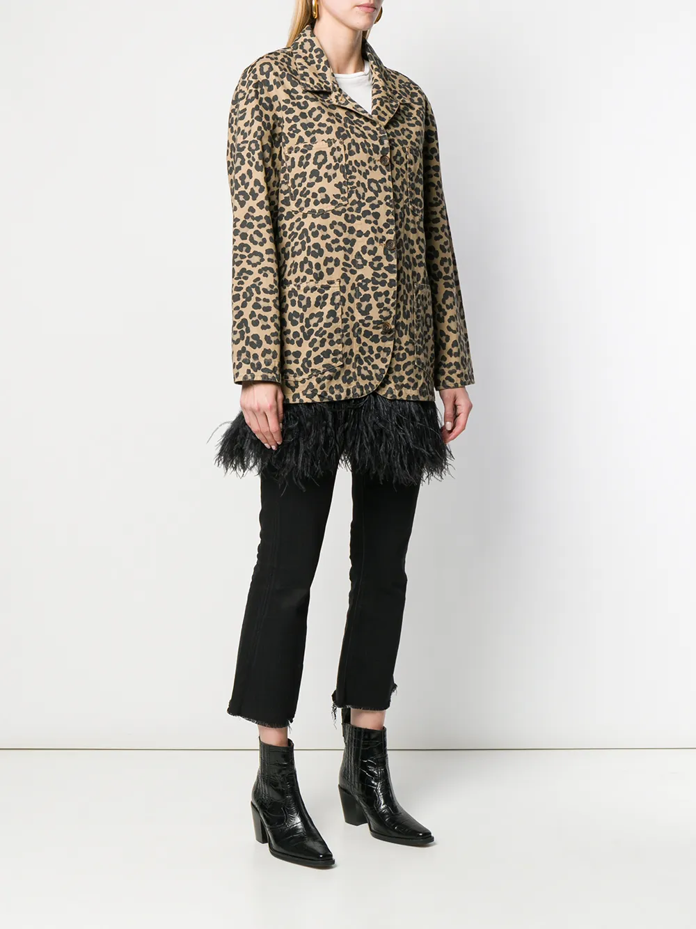 Пальто с леопардовым принтом и перьями от Simonetta Ravizza. Зазубренный воротник, застежка на пуговицах спереди, длинные рукава, леопардовый принт, нагрудный карман и два передних кармана.
