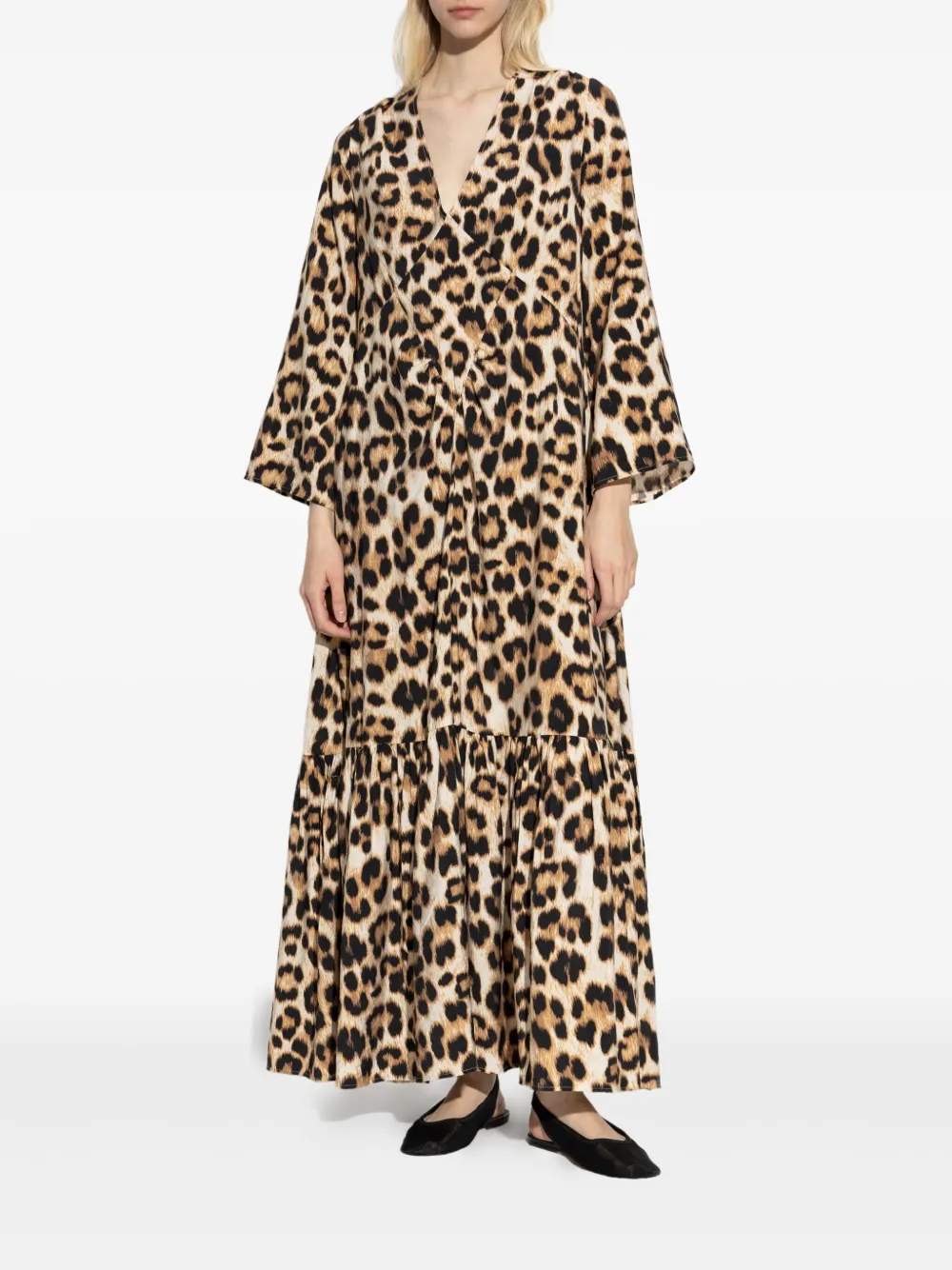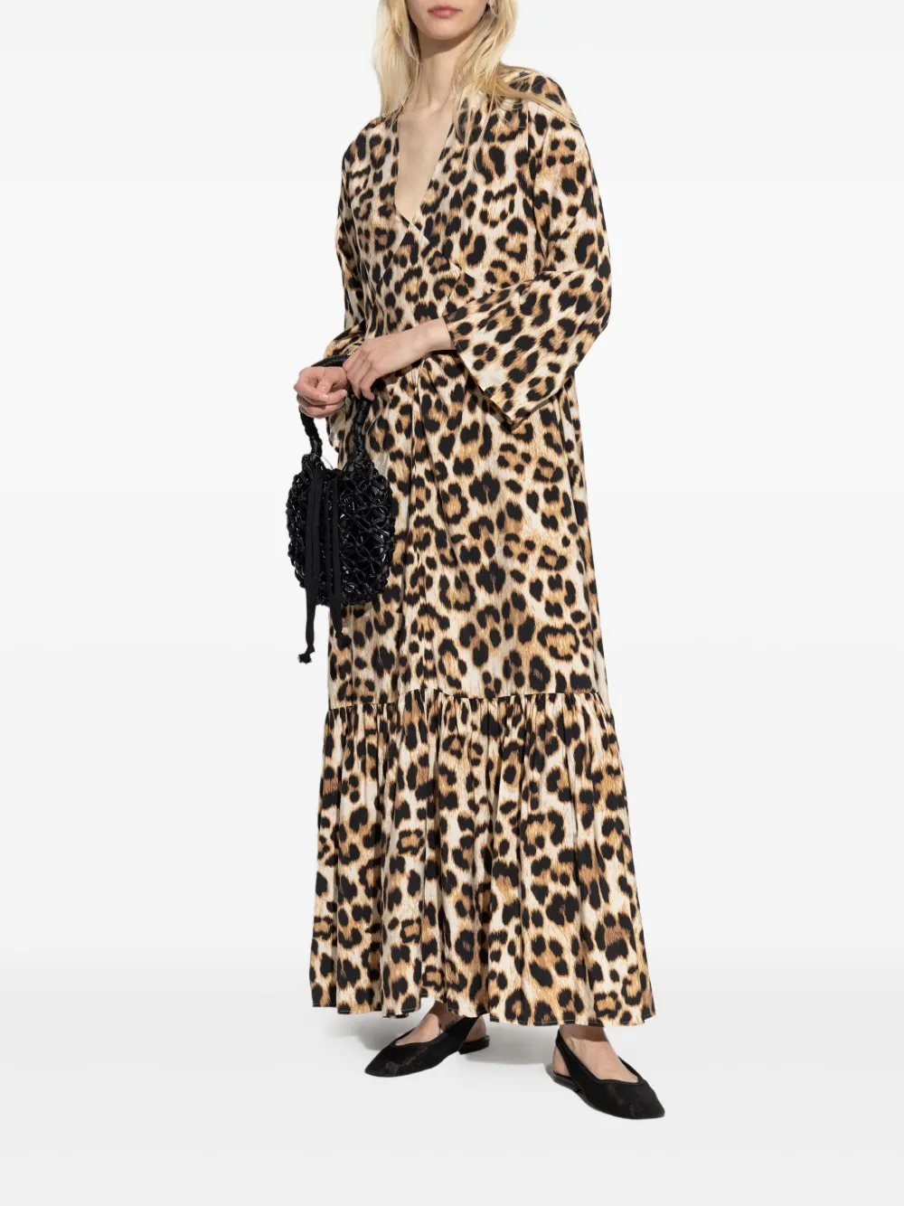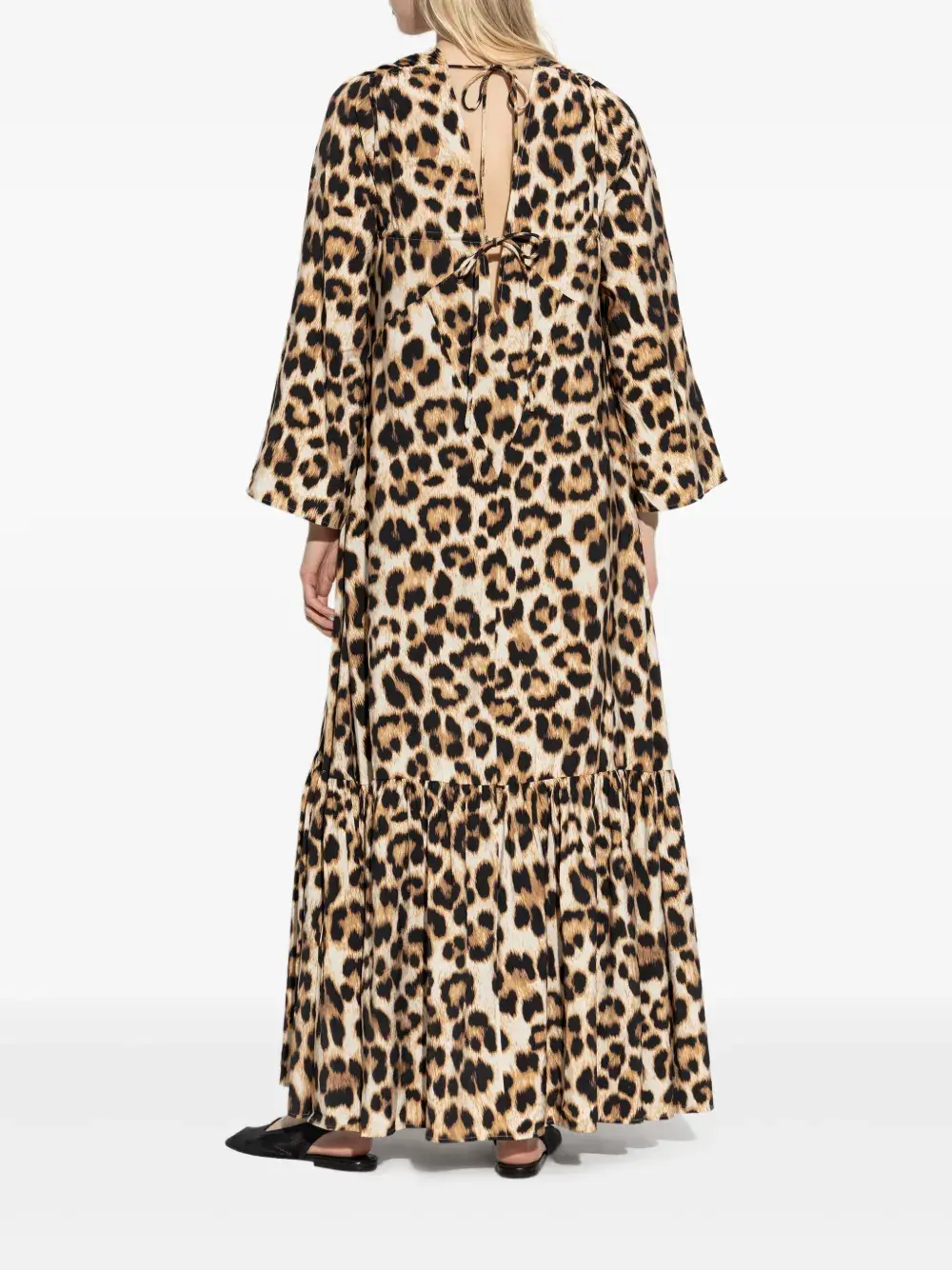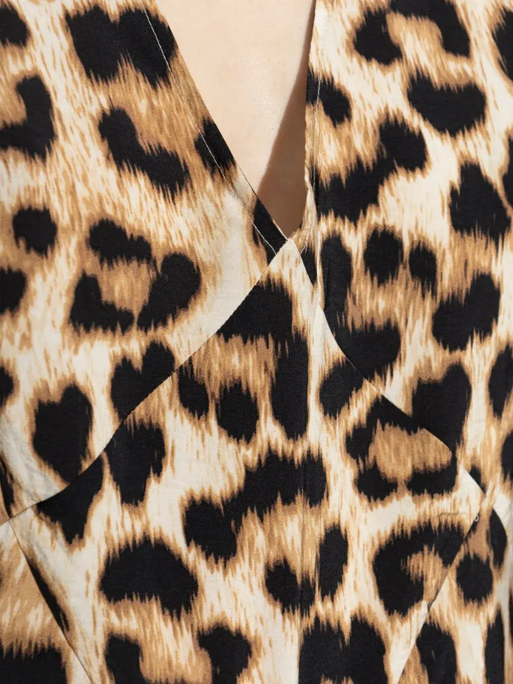 Бежевый, с завязкой сзади, с анималистичным принтом, V-образным вырезом, оборкой по низу, длинными расклешенными рукавами.