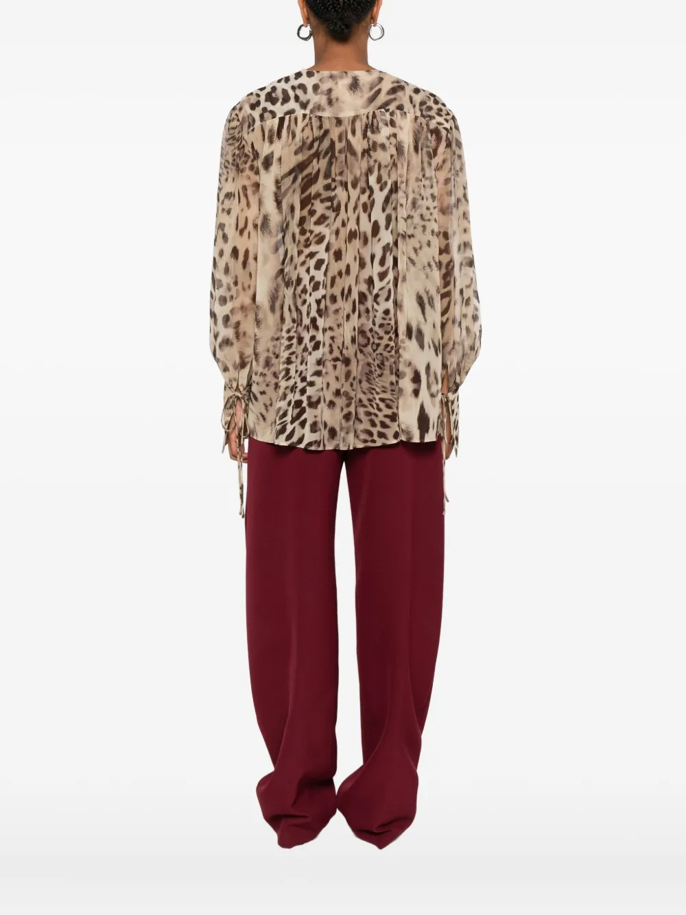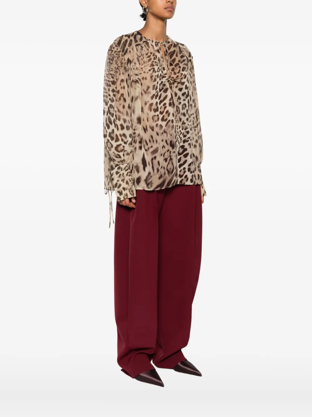 Бежевый леопардовый принт, завязка на шее, длинные рукава, плиссированные детали, полупрозрачная конструкция
