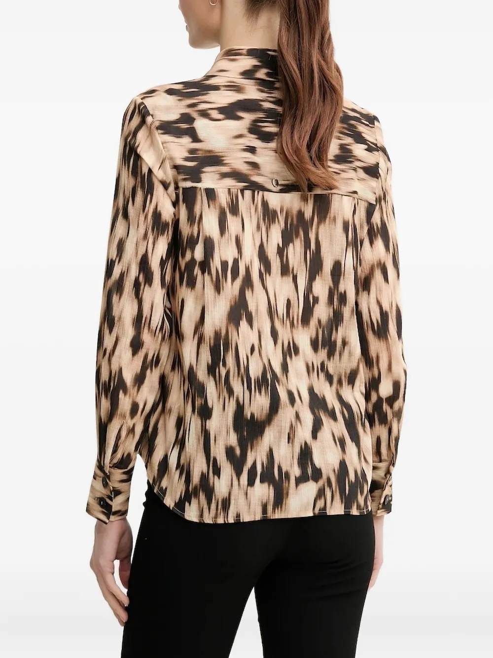 Бежевый леопардовый принт, застежка на пуговицы, длинные рукава, накладные карманы, воротник-поло