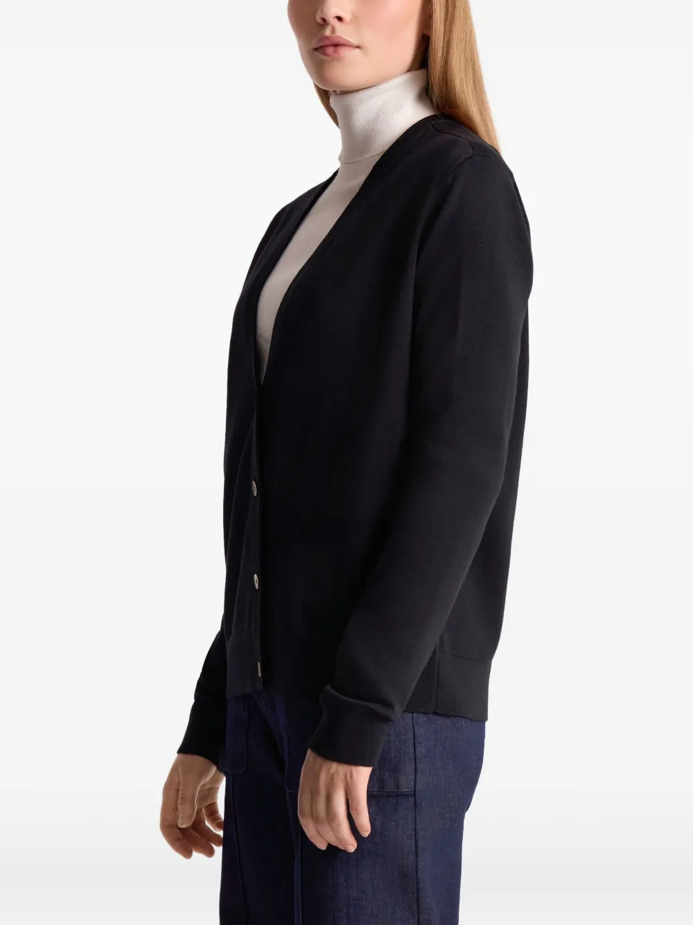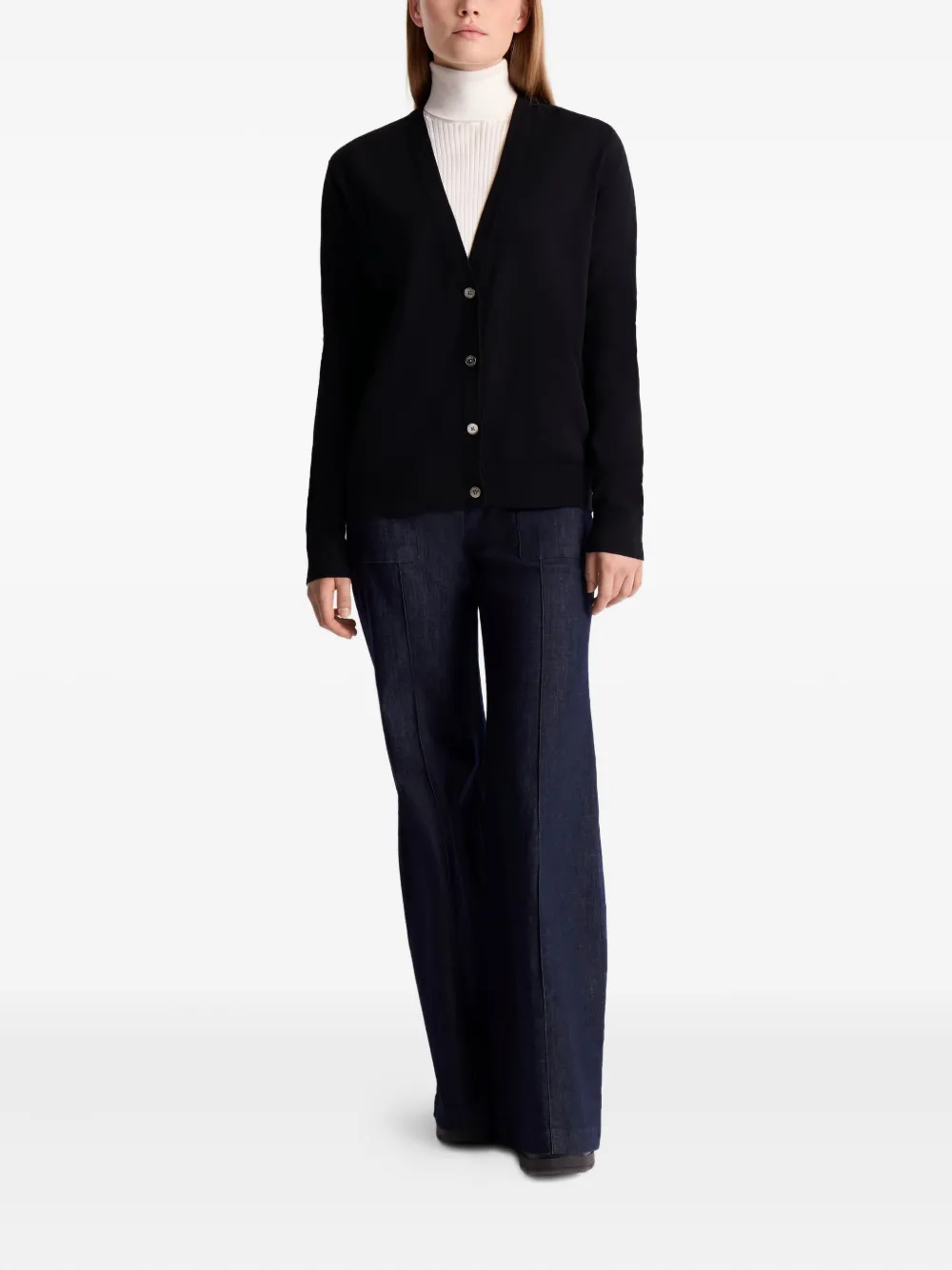 Черная шерстяно-шелковая смесь, застежка на пуговицы, V-образный вырез, длинные рукава.