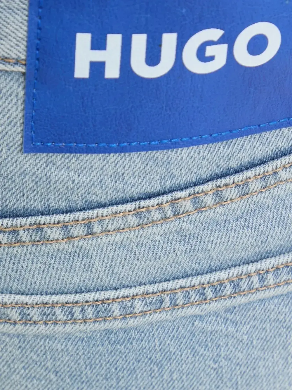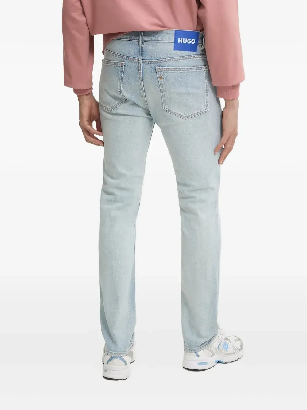 Светло-голубая нашивка с логотипом сзади, прямой крой, пять карманов, потайная застежка на пуговицы, шлевки для ремня