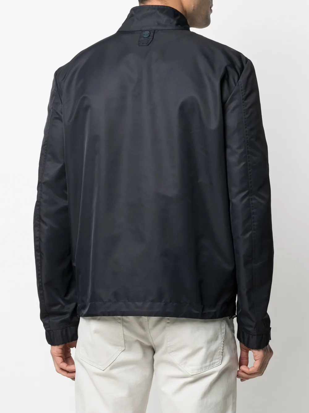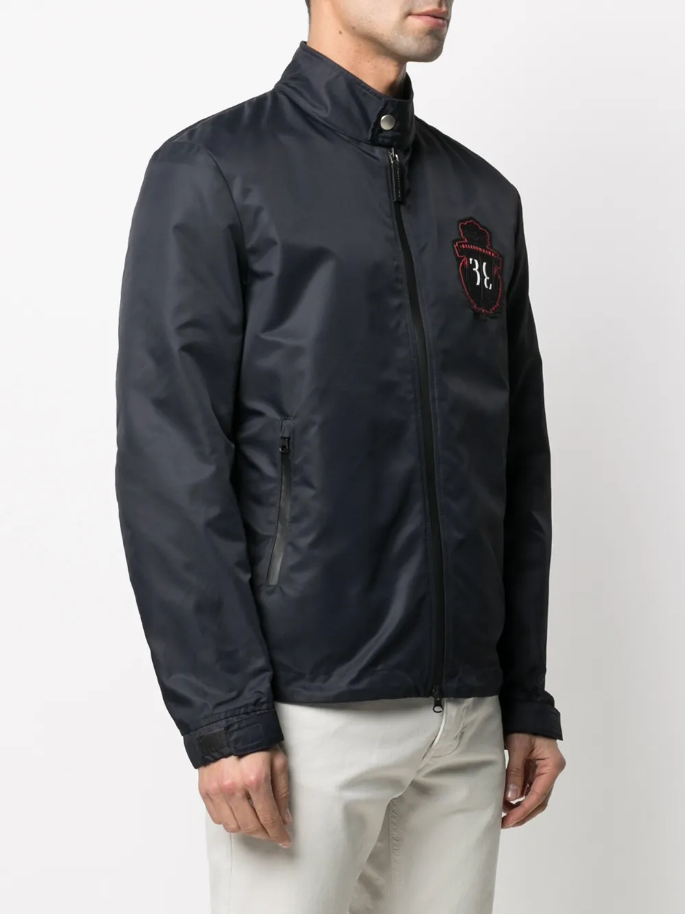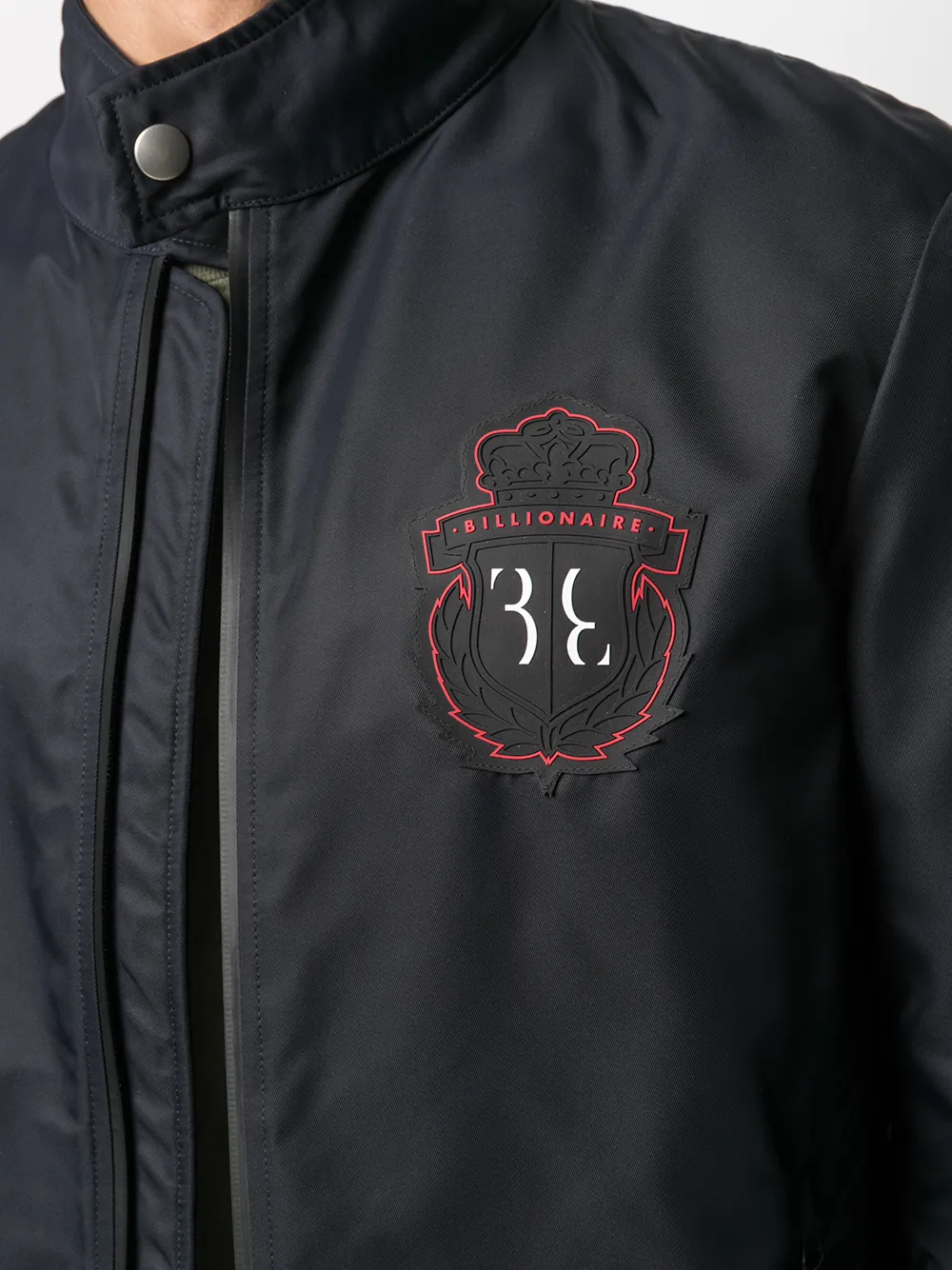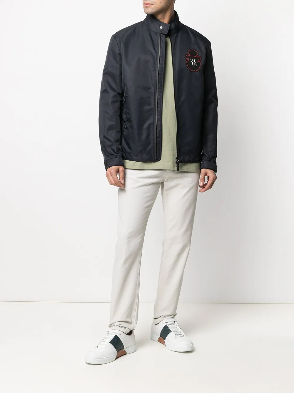 Нашивка с логотипом спереди, воротник-стойка, застежка на молнии спереди, длинные рукава и два кармана на молнии по бокам.
