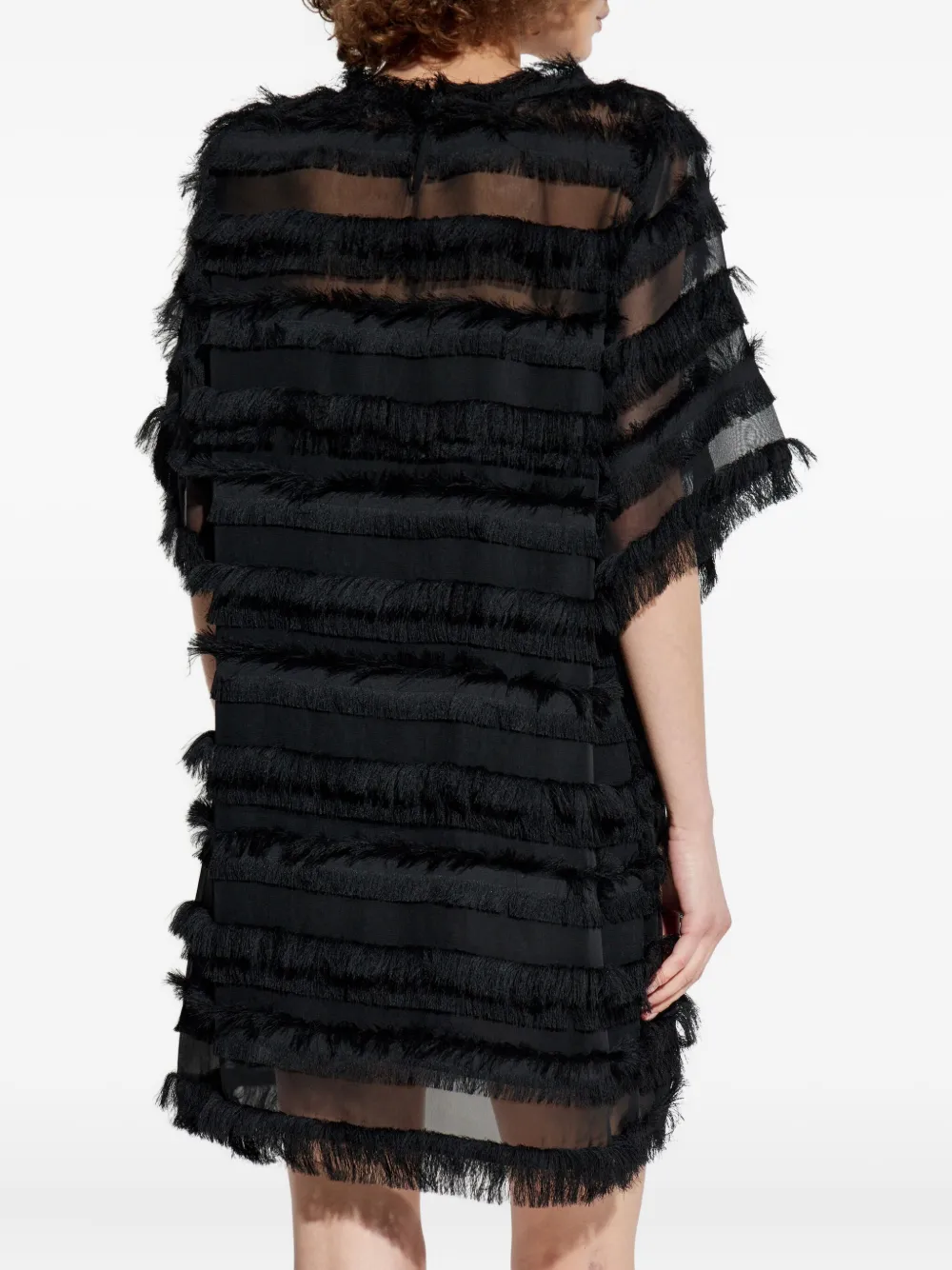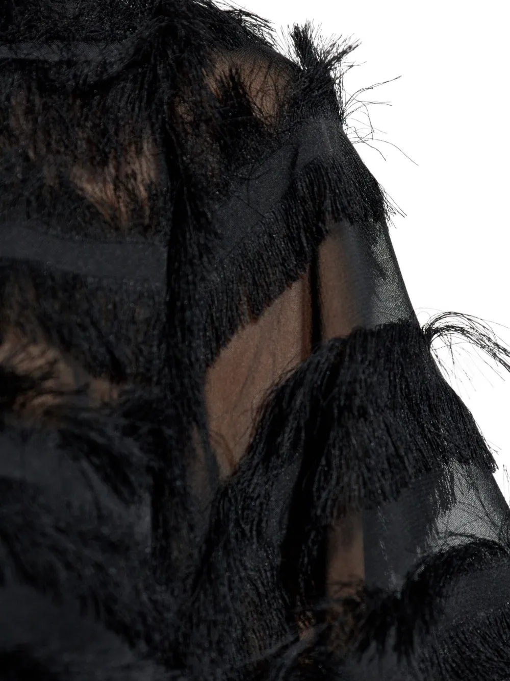 Черная прозрачная ткань, отделка бахромой, короткие рукава, круглый вырез, многослойная бахрома.