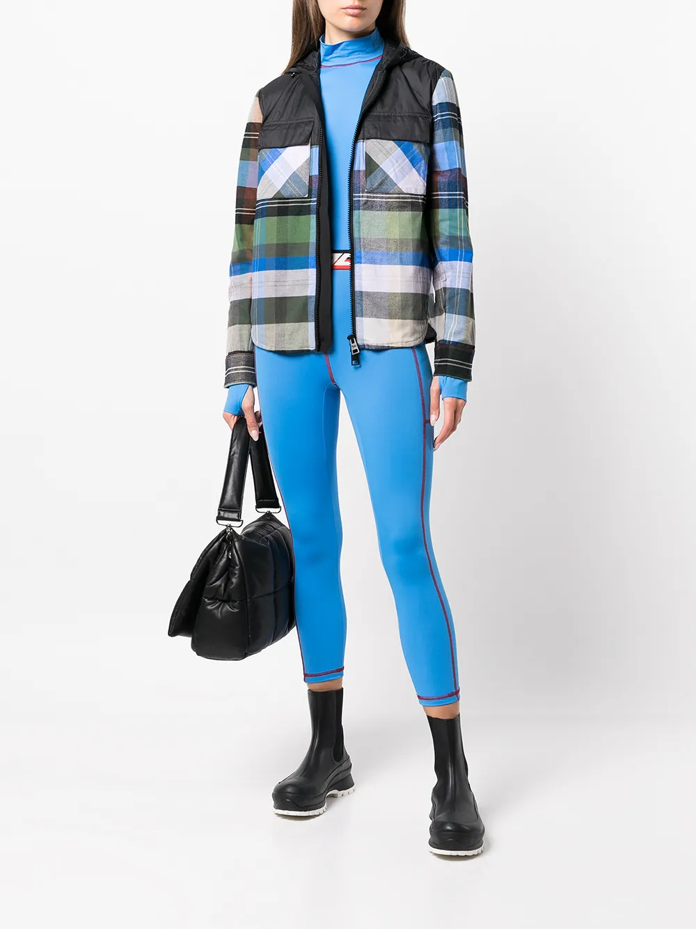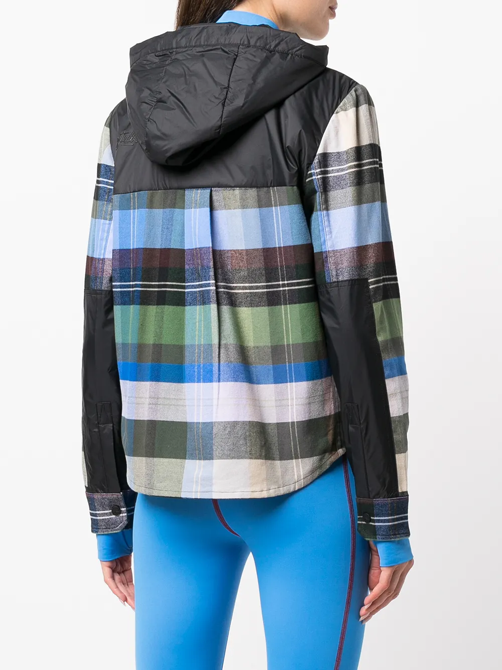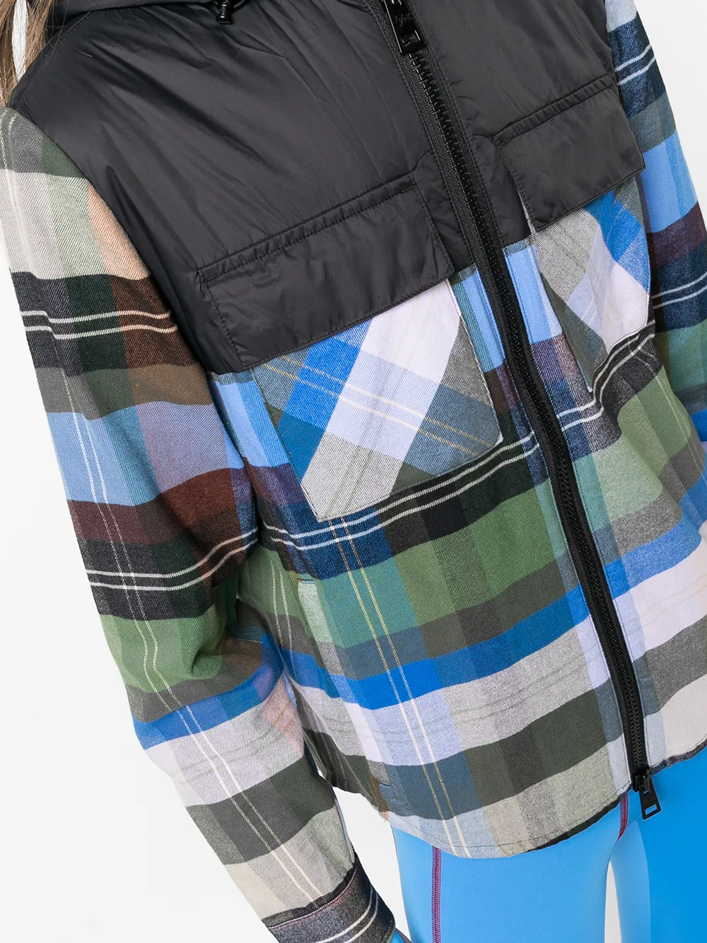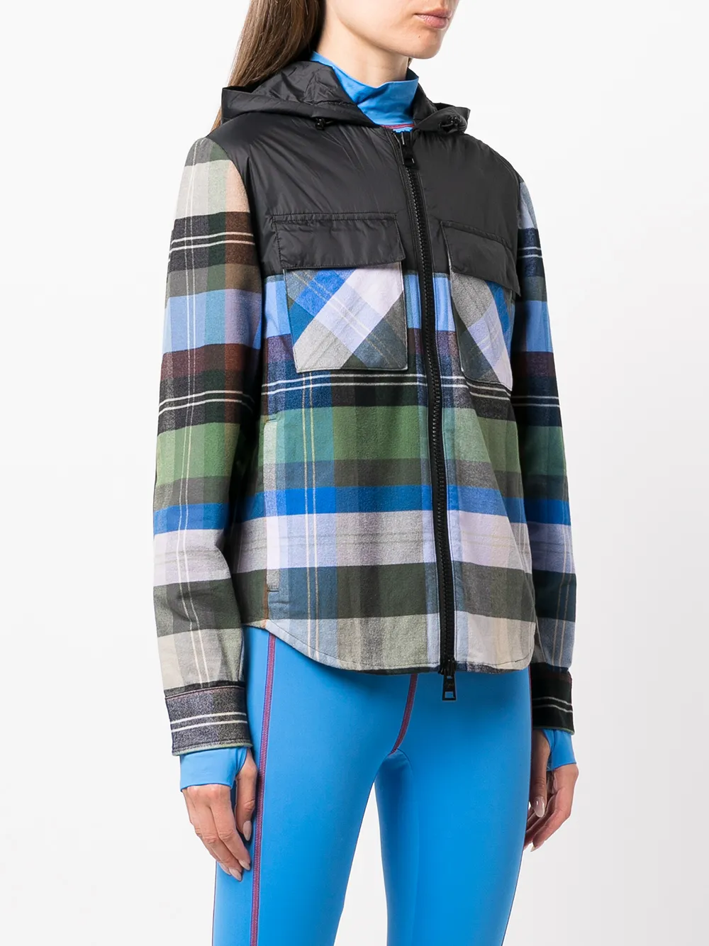 Разноцветный, клетчатый узор, затягивающийся на шнурок капюшон, дутые вставки, два передних кармана с клапанами, застежка на молнии спереди, классический капюшон, длинные рукава и закругленный подол.