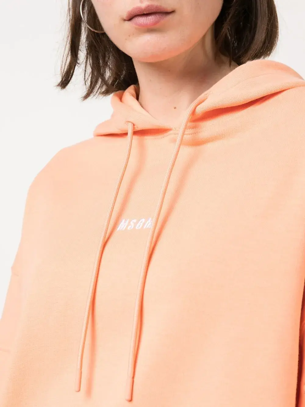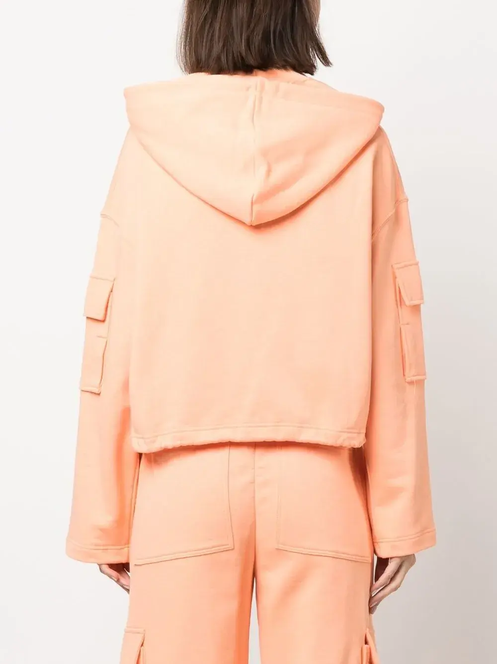 Персиково-оранжевый, хлопок, логотип спереди, затягивающийся на шнурок капюшон, длинные рукава, накладной карман на рукаве, подол с кулиской и укороченная длина.