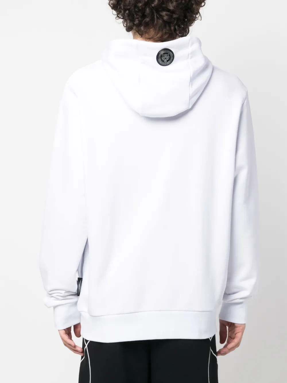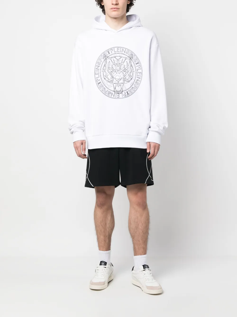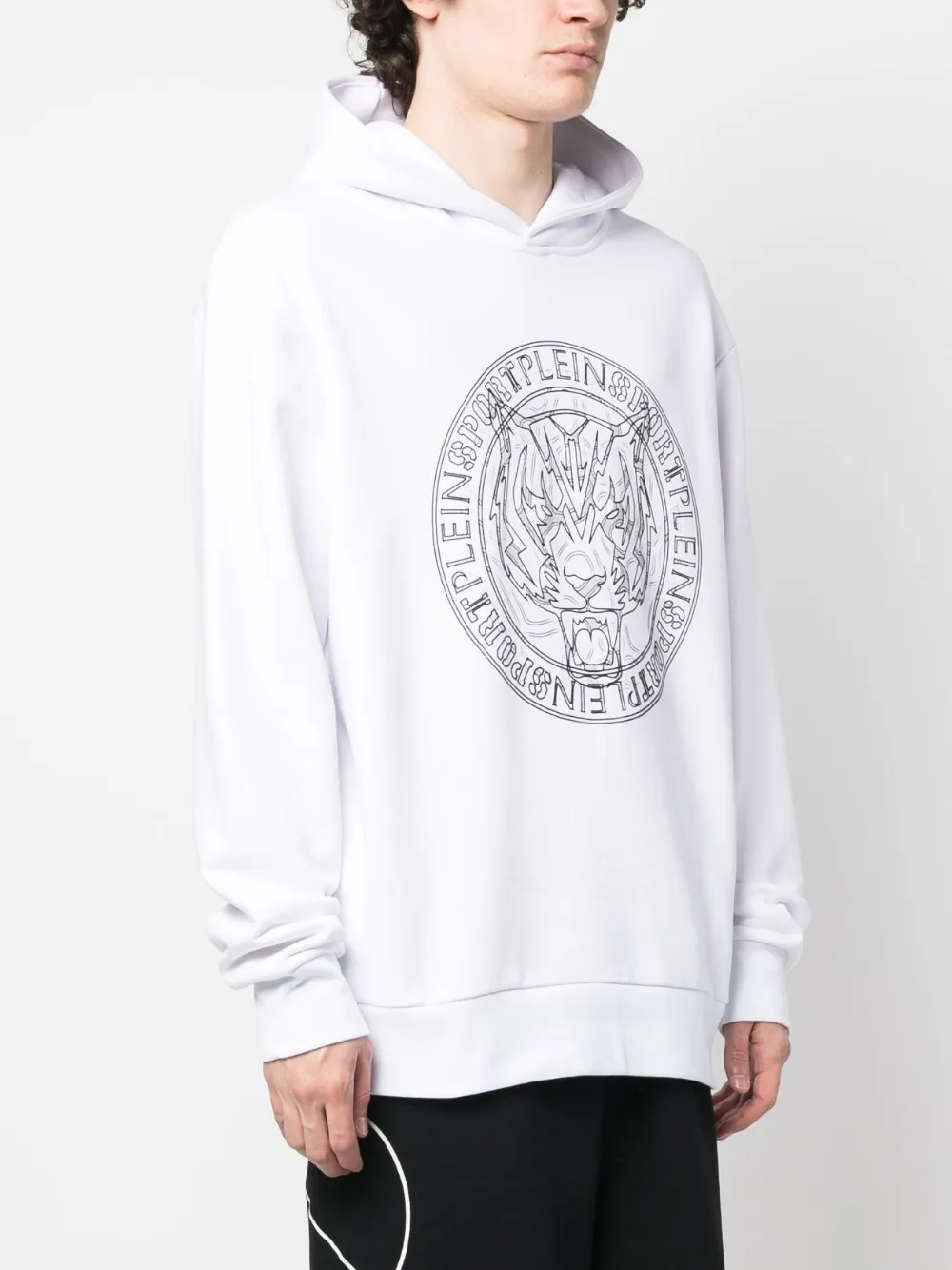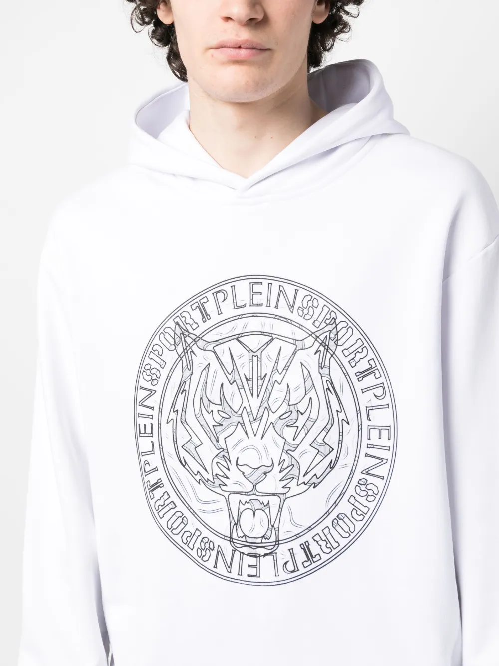 Белый, логотип спереди, знаковый декор Tiger с изображением тигра, классический капюшон, длинные рукава и прямой подол.