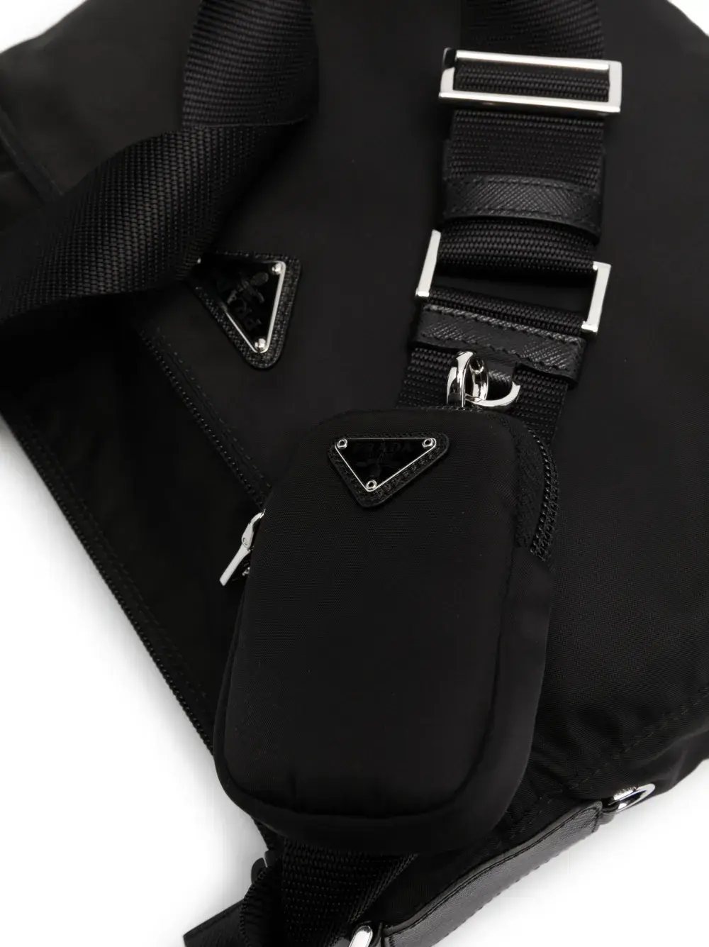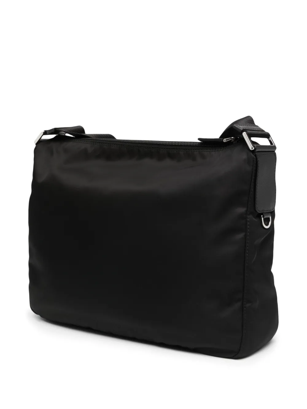 Треугольный эмалированный логотип, регулируемый ремень на плечо, серебристая фурнитура, застежка на молнии спереди, застежка на молнии сверху, подкладка с логотипами, внутренний карман на молнии, внутренний прорезной карман и металлический логотип внутри. Цвет: черный.