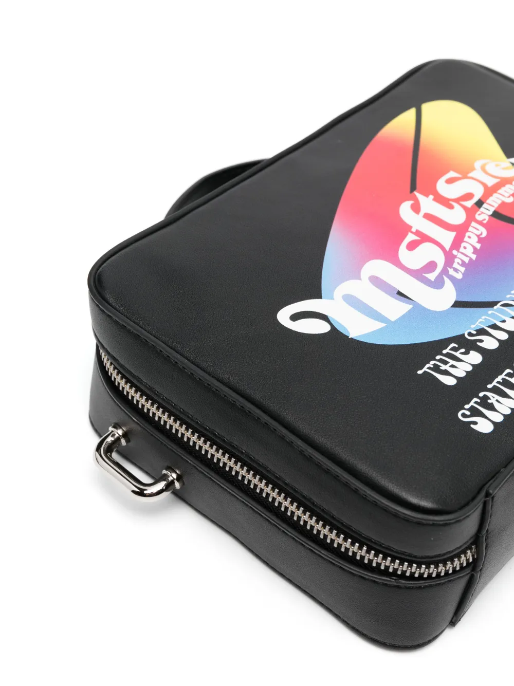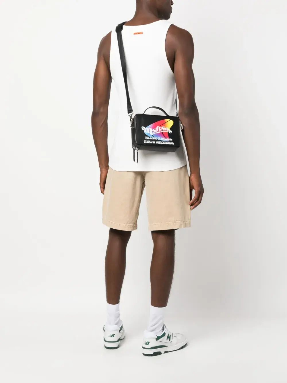 Черный, разноцветный, искусственная кожа, логотип спереди, застежка на молнии сверху, плоская ручка сбоку, съемный ремень на плечо и основное отделение.