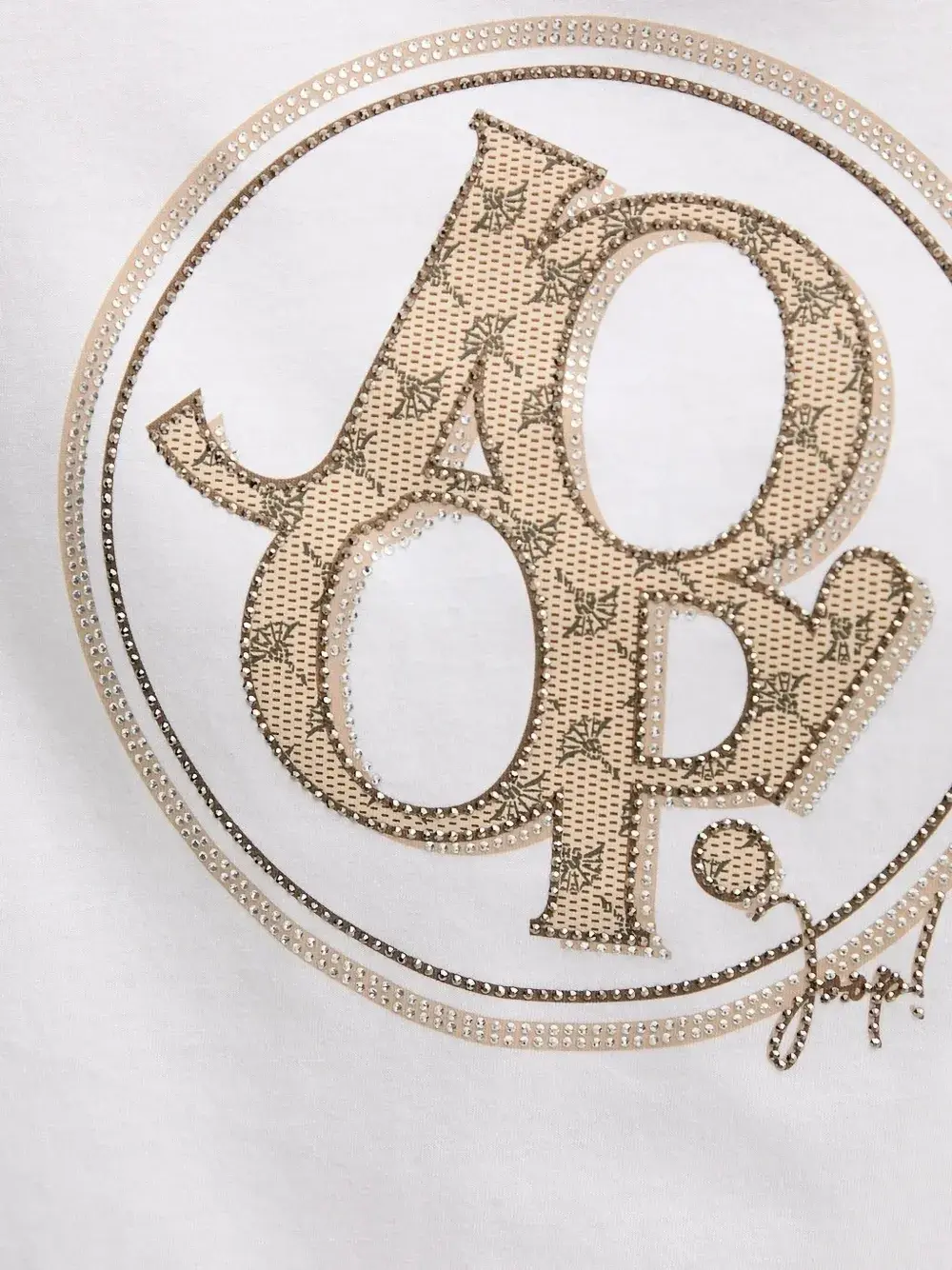 Белое платье с короткими рукавами, круглым вырезом и отделкой стразами.