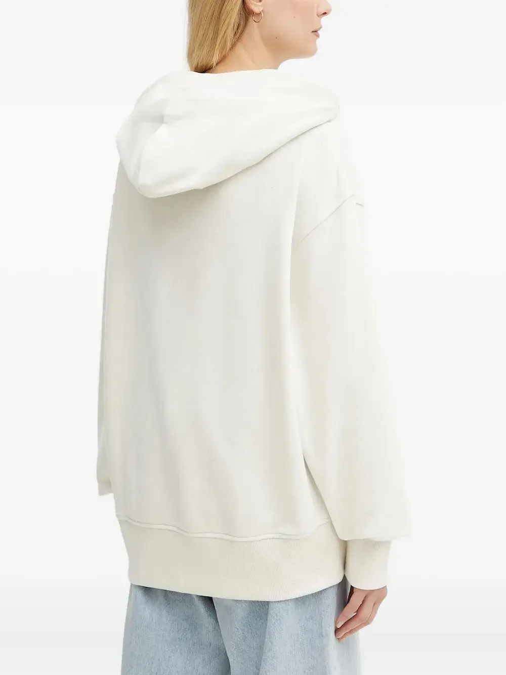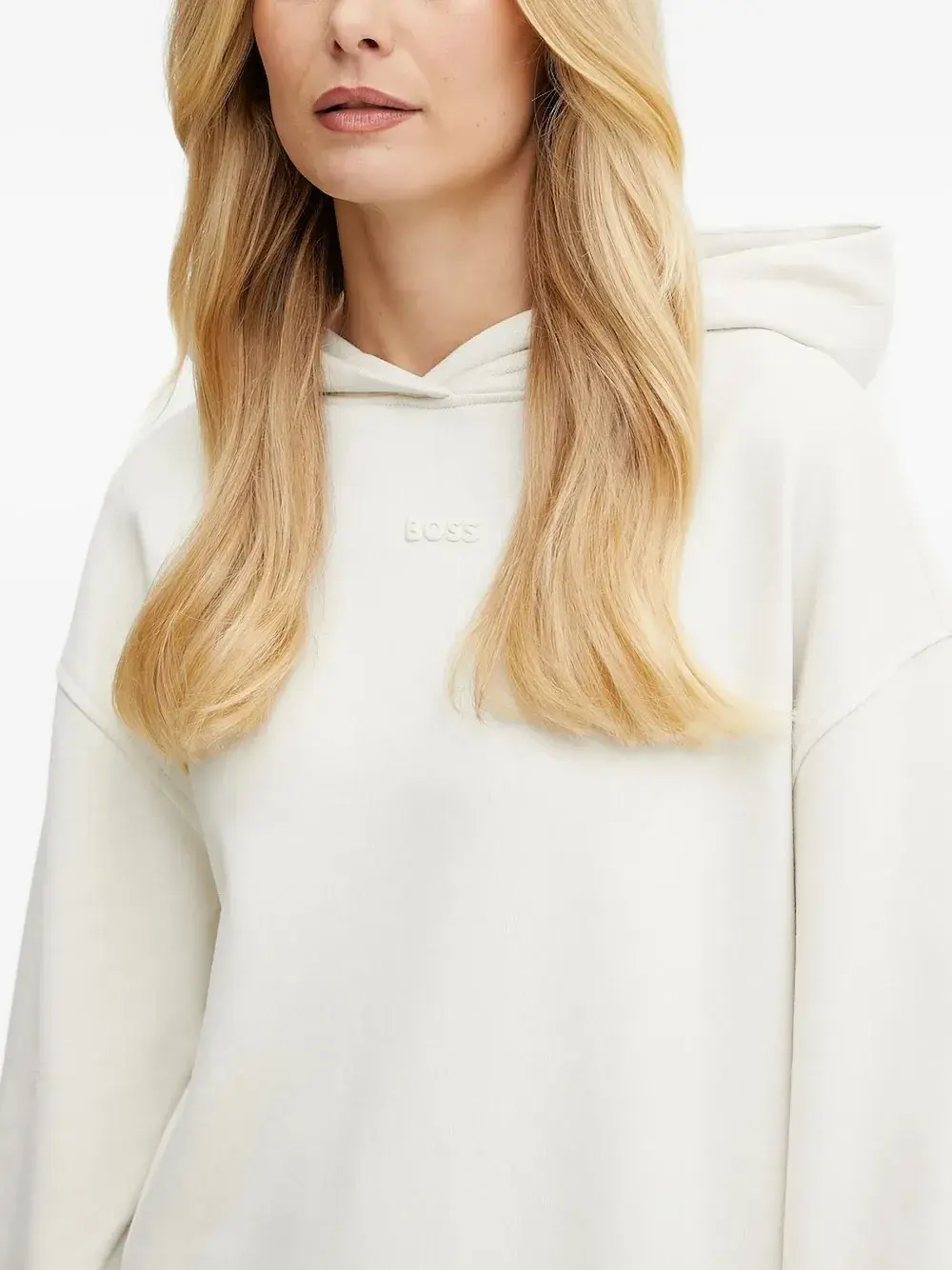 Белый классический капюшон, спущенные плечи, длинные рукава, тисненый логотип.