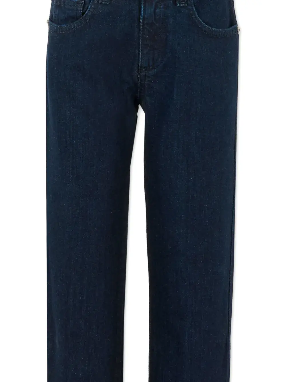 Темно-синяя хлопковая ткань с логотипом на спинке, пять карманов, застежка на пуговицы