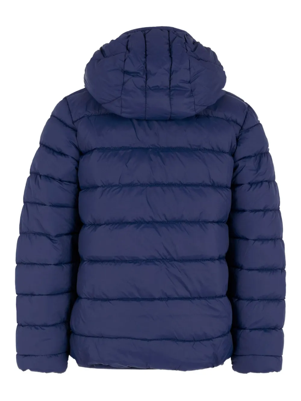 Синий стеганый дизайн, капюшон, застежка-молния, длинные рукава, логотип.