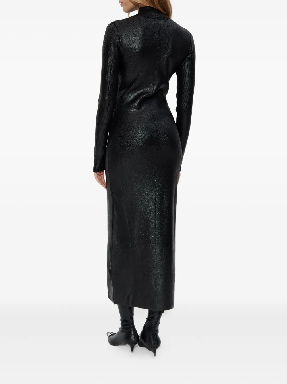 Черная ребристая текстура, высокий ворот, длинные рукава, вырезанный логотип.