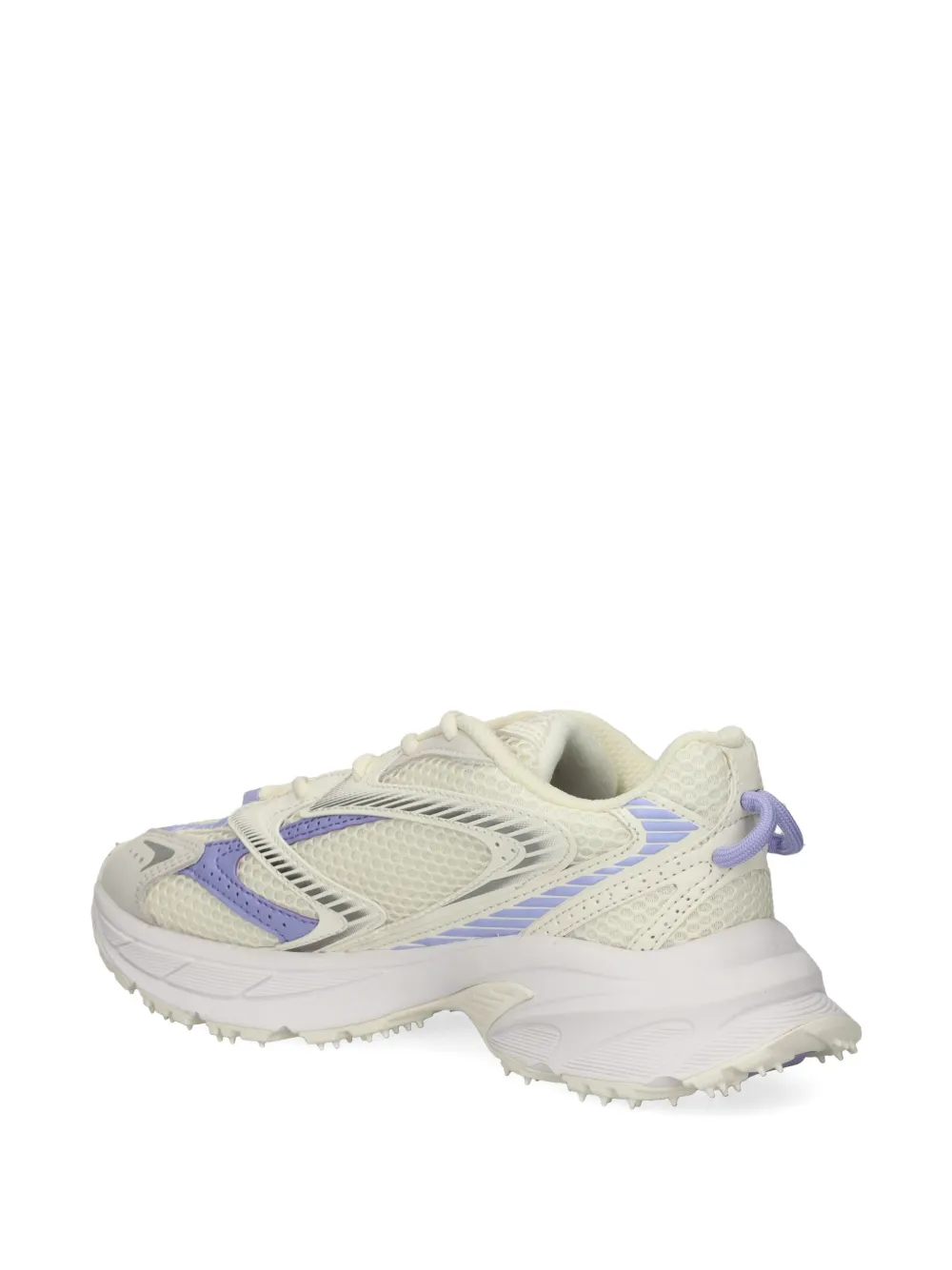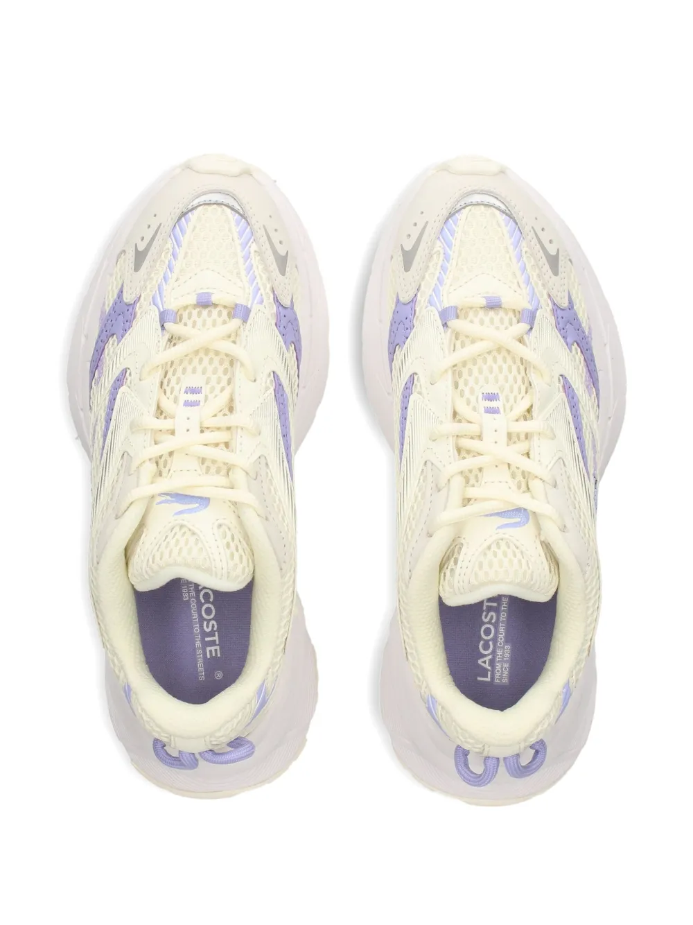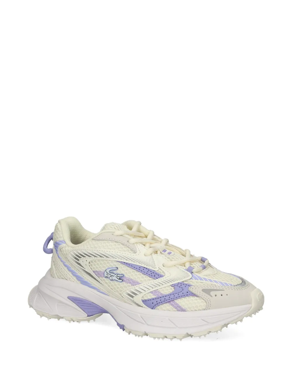 Бежевая сетчатая панель, шнуровка, резиновая подошва, фиолетовые детали, логотип в виде крокодила.