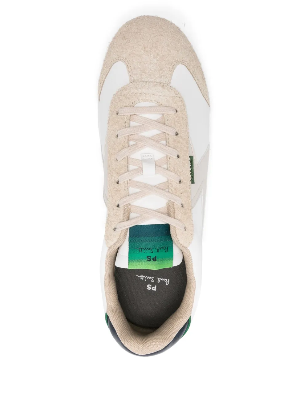 Белая замшевая панель, резиновая подошва, шнуровка, логотип.