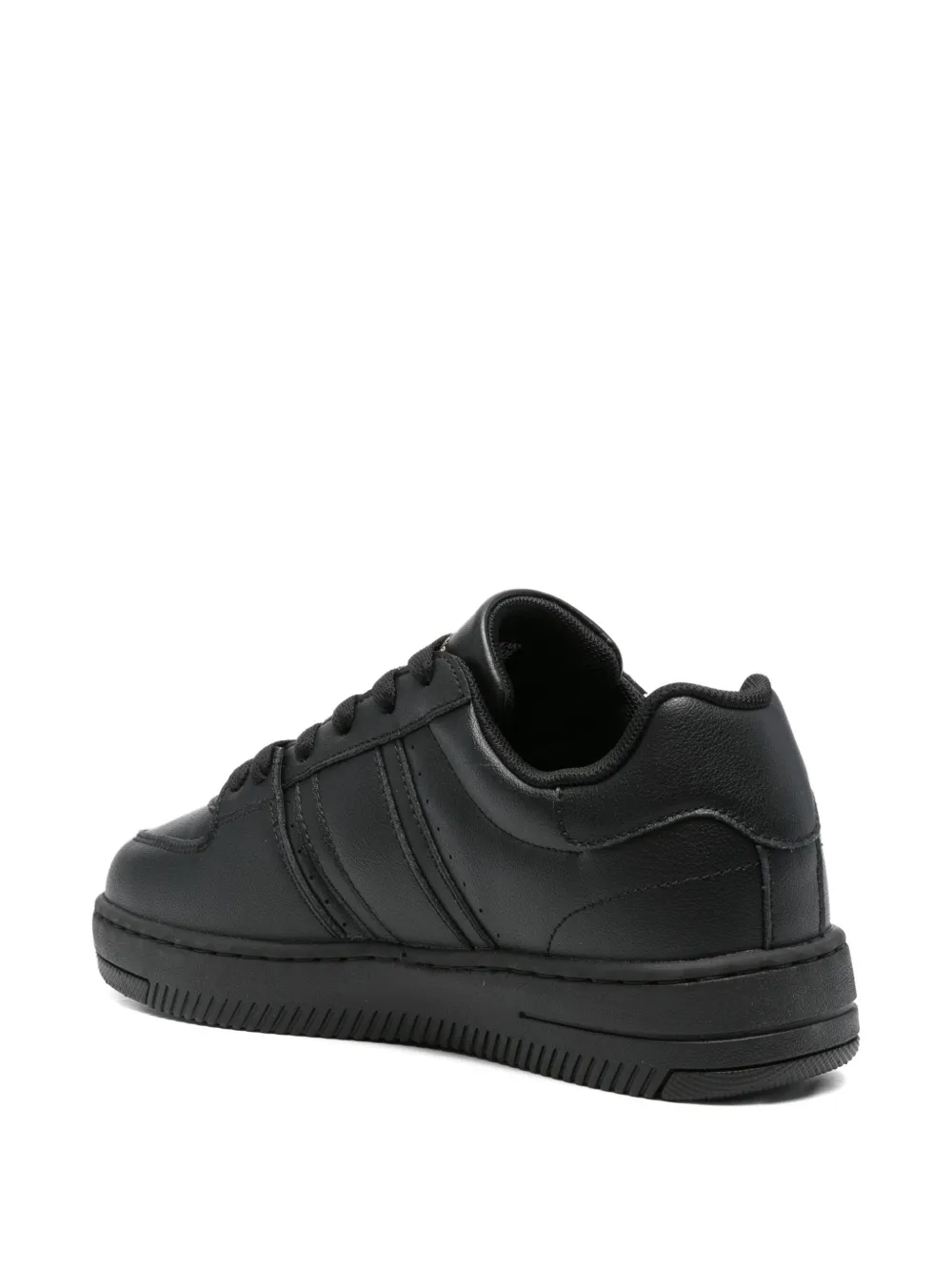 Верх из черной кожи, шнуровка, резиновая подошва, золотой логотип, боковые полосы.