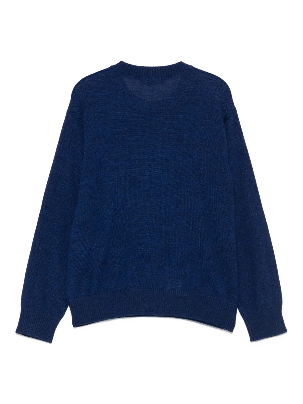 Темно-синий круглый вырез горловины, длинные рукава, ребристый подол и манжеты с логотипом.