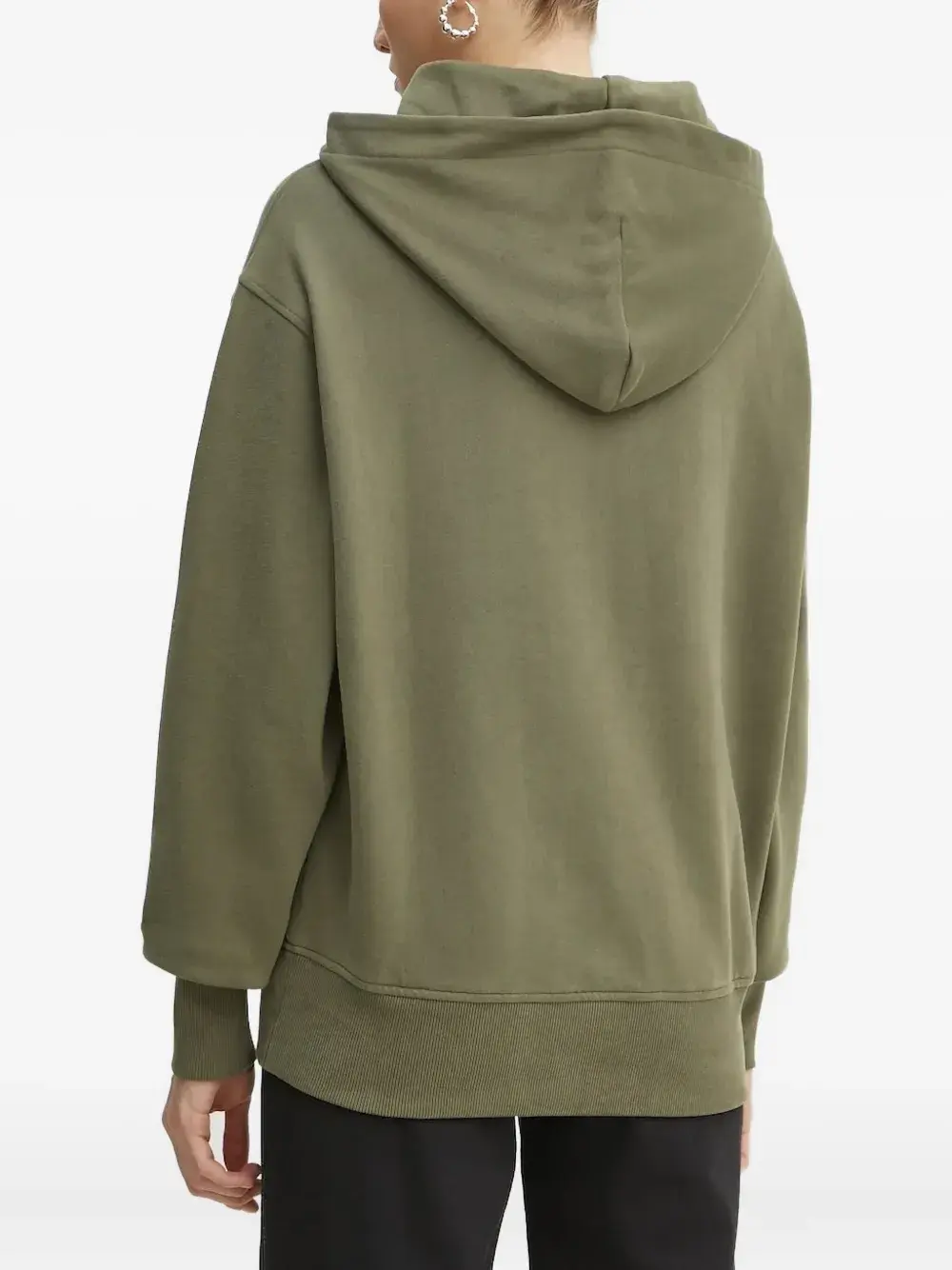 Оливково-зеленый, капюшон на шнурке, спущенные плечи, длинные рукава, ребристые манжеты, тисненый логотип.
