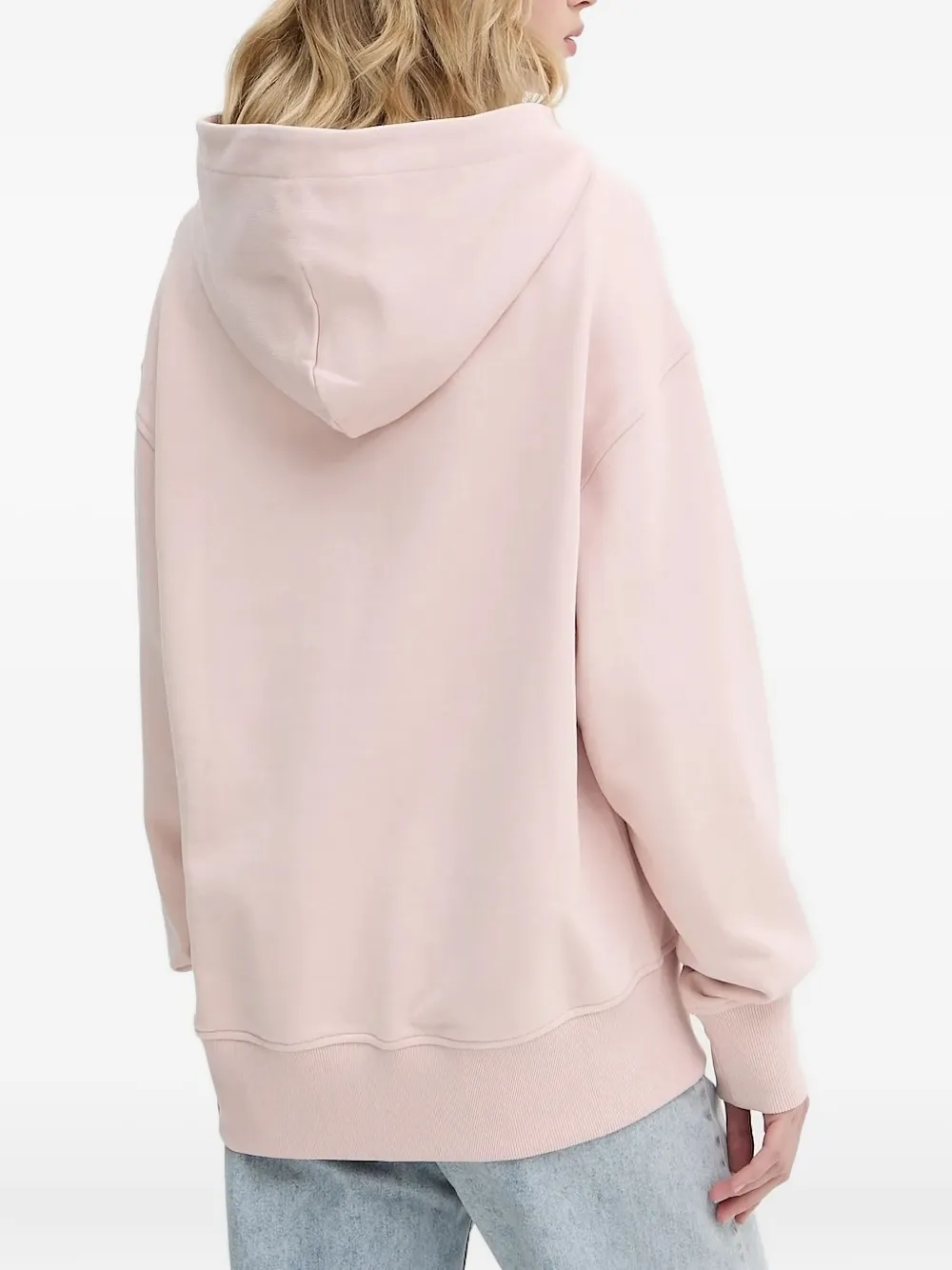 Розовый капюшон, спущенные плечи, длинные рукава, манжеты, тисненый логотип.