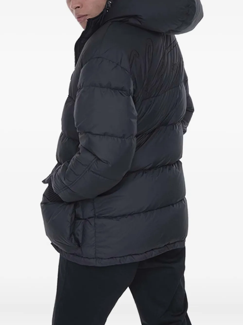 Черный капюшон с вышитым логотипом, стеганый дизайн, карманы с клапанами, затягивающийся шнурок на подоле.