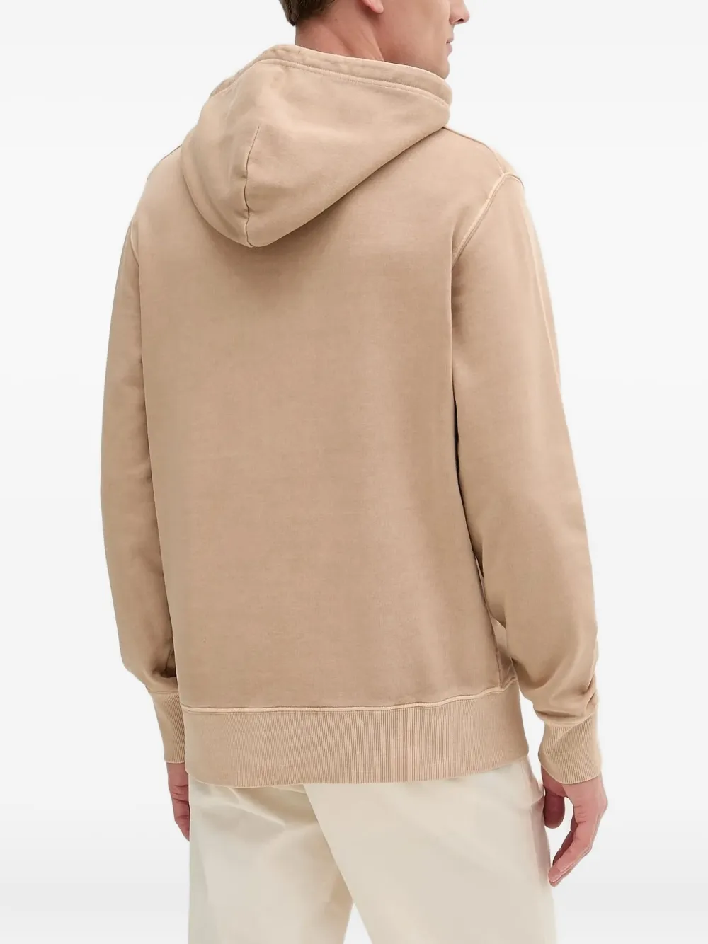 Бежевый капюшон на шнурке, карман-кенгуру, длинные рукава, ребристые манжеты, вышитый логотип.