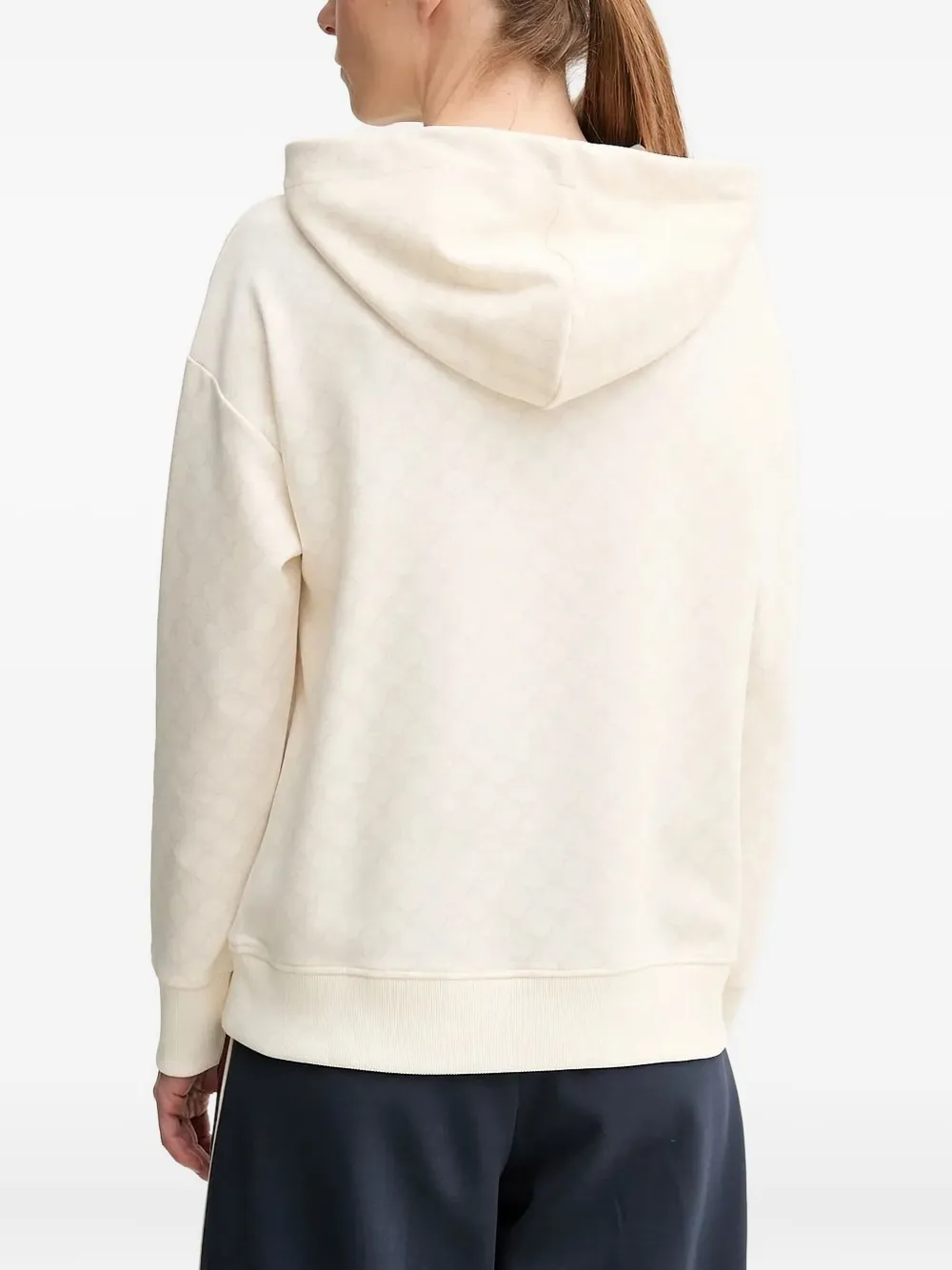 Вышитый логотип кремового цвета, капюшон на шнурке, карман-кенгуру, ребристые манжеты, узор с логотипом по всей поверхности