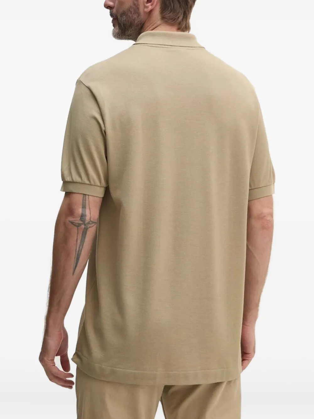 Бежевый, с короткими рукавами, планкой на двух пуговицах, вышитым логотипом.