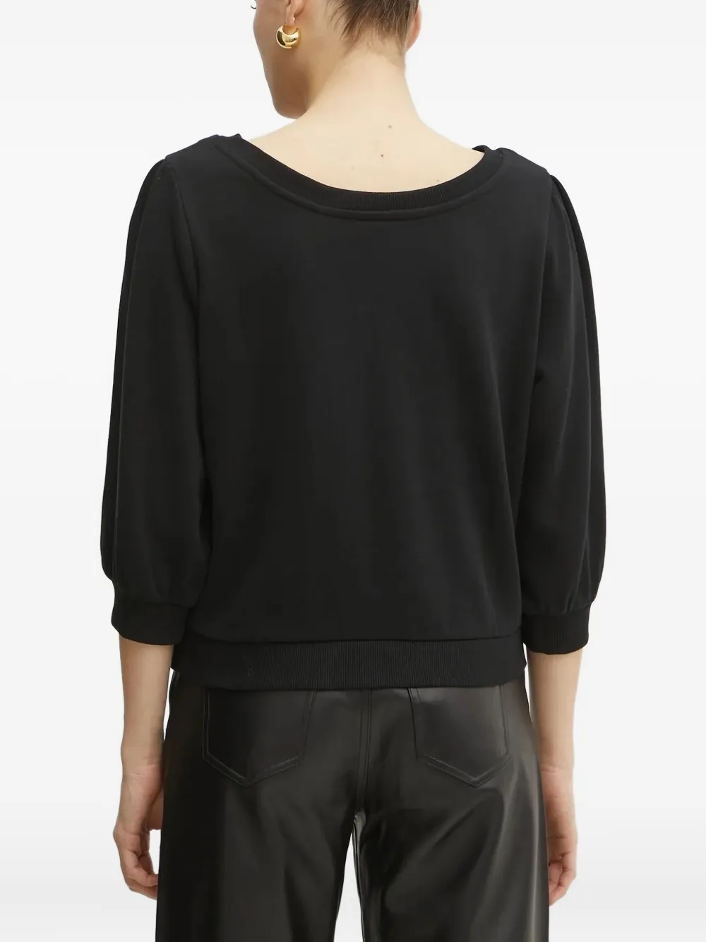 Черная модель с вышитым логотипом, вырезом-лодочкой и рукавами три четверти.