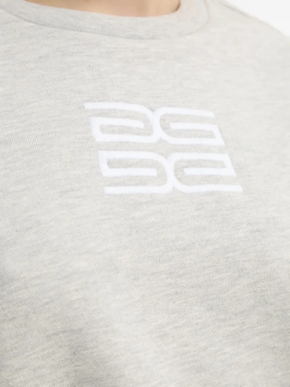 Серый вышитый логотип, круглый вырез горловины, спущенные плечи, длинные рукава.