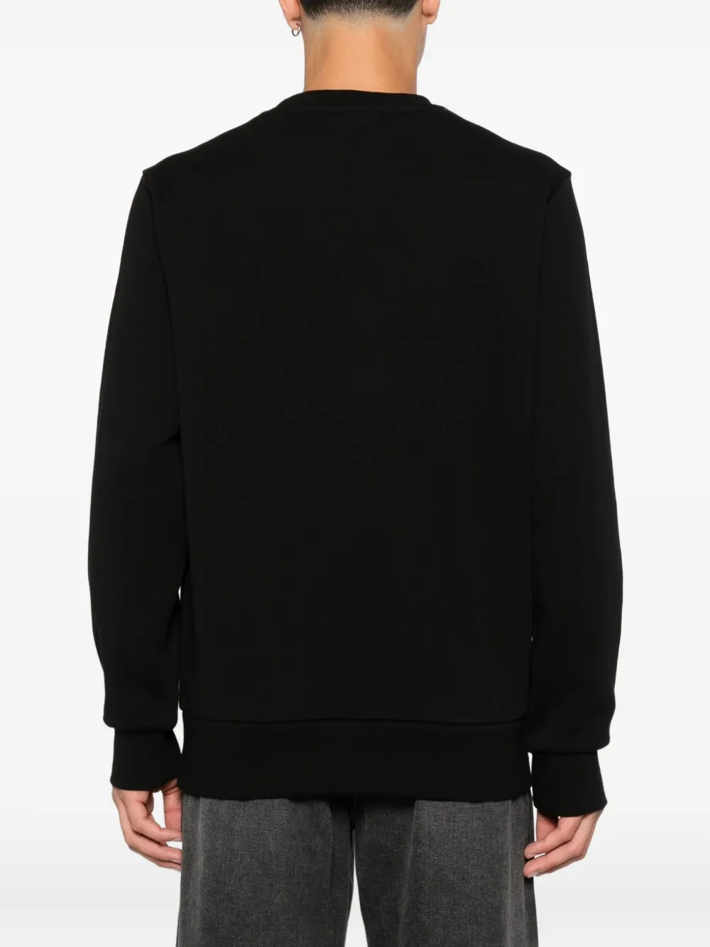 Черный вышитый логотип, круглый вырез горловины, длинные рукава, ребристые манжеты и подол.