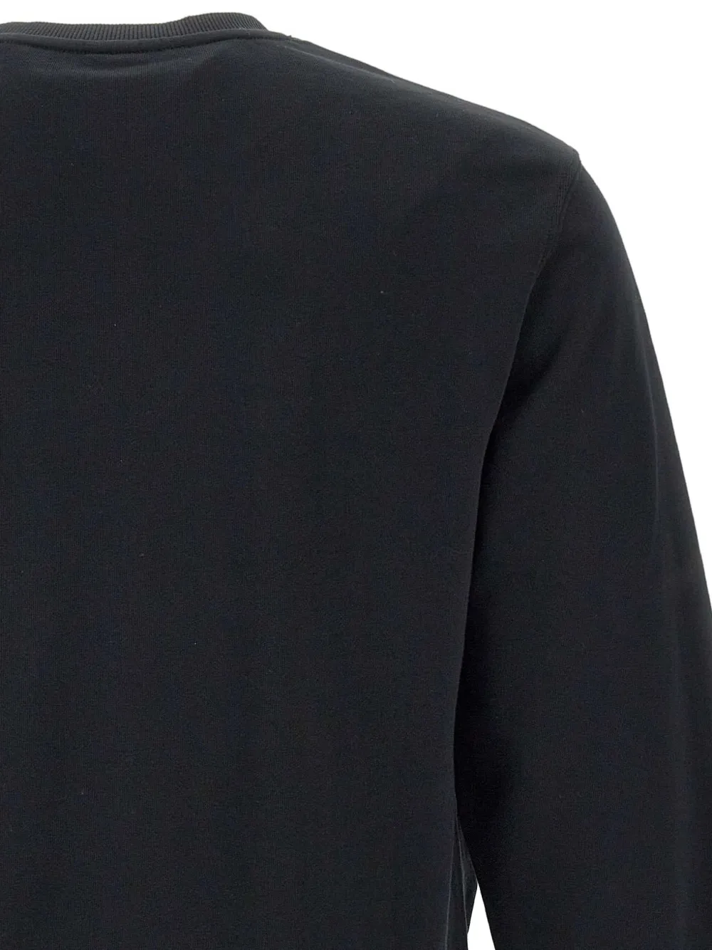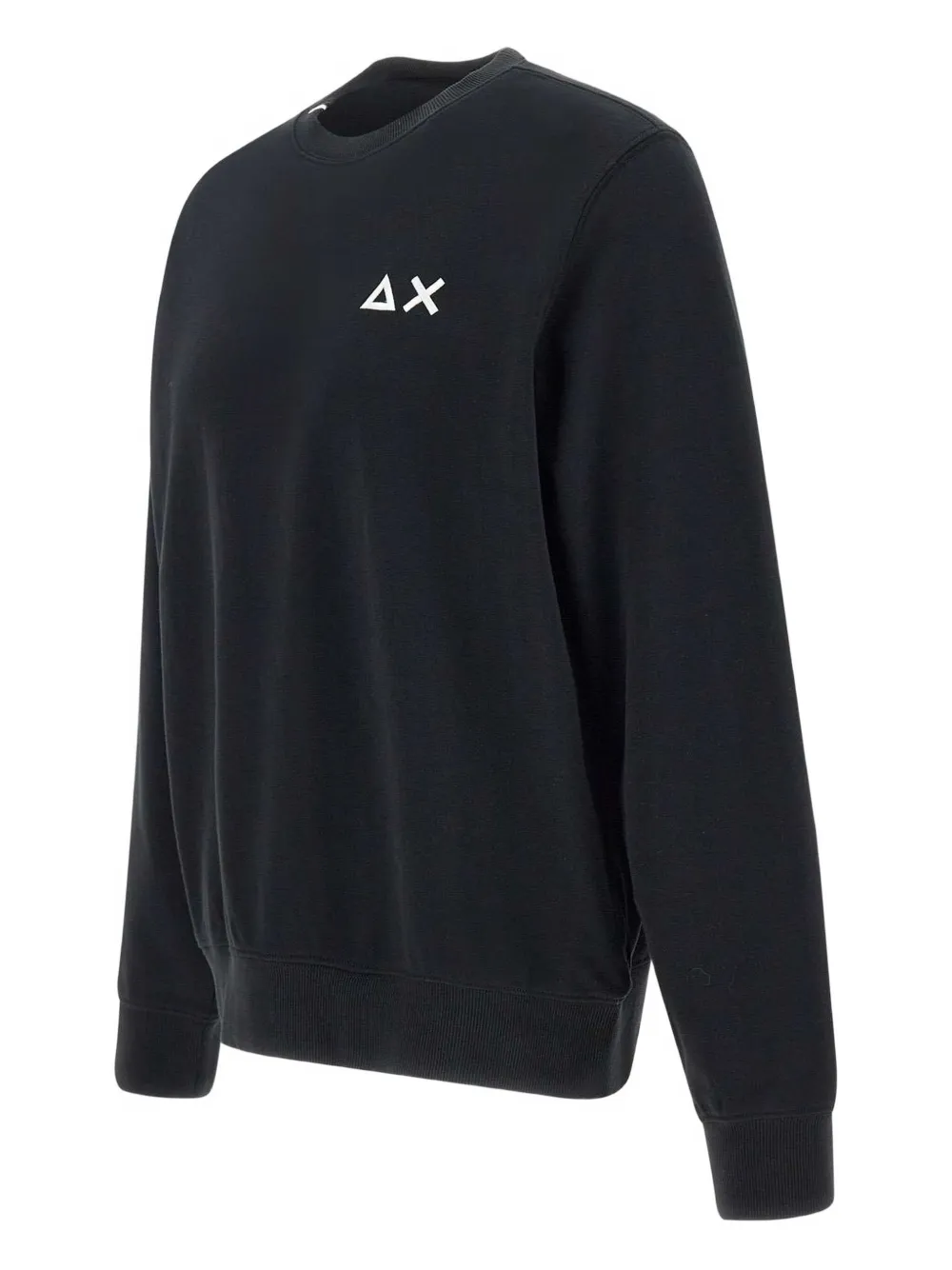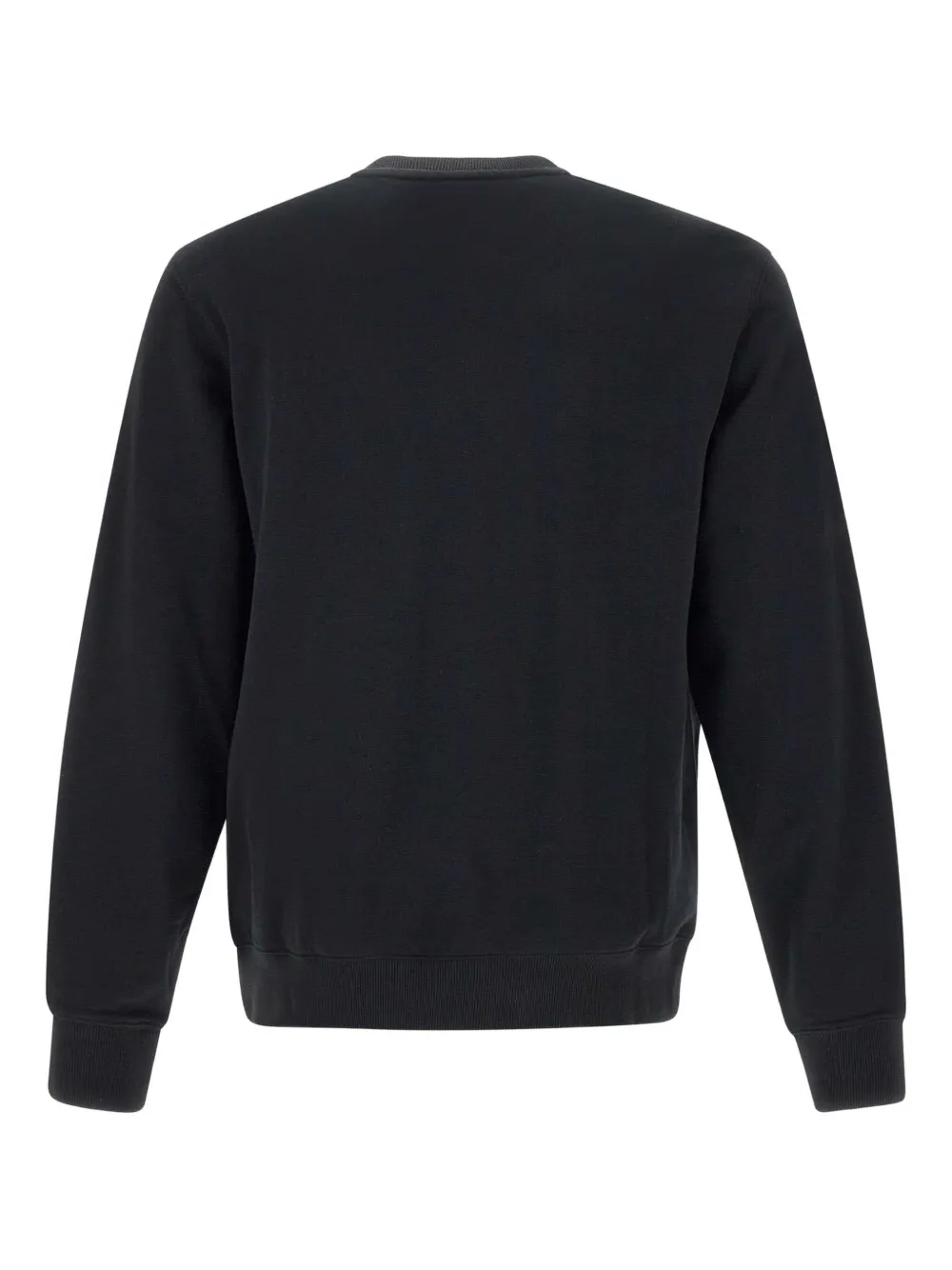 Черный вышитый логотип, круглый вырез, длинные рукава, ребристые манжеты.