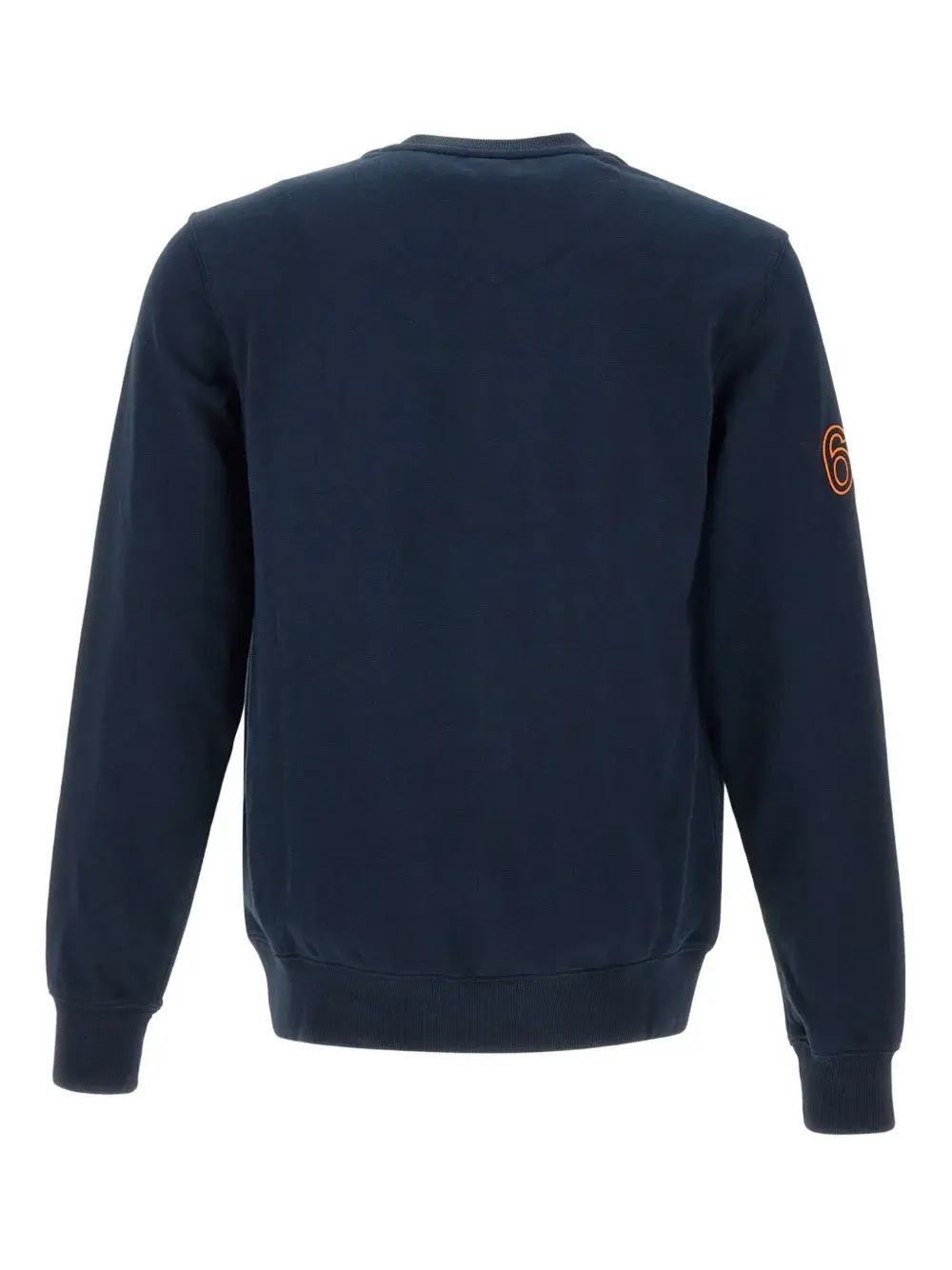 Вышитый логотип темно-синего цвета, круглый вырез горловины, длинные рукава, ребристые манжеты и подол.