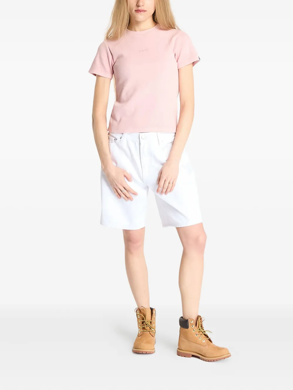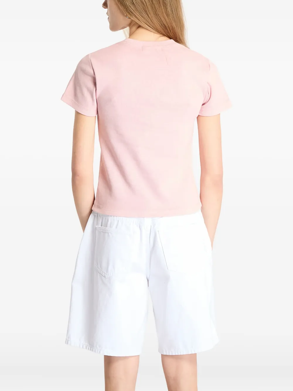 Короткие рукава, круглый вырез, вышитый логотип, розовая резинка.