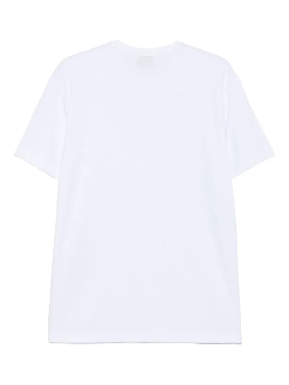 Белая футболка с короткими рукавами, круглым вырезом, вышитым логотипом и золотистыми буквами логотипа.