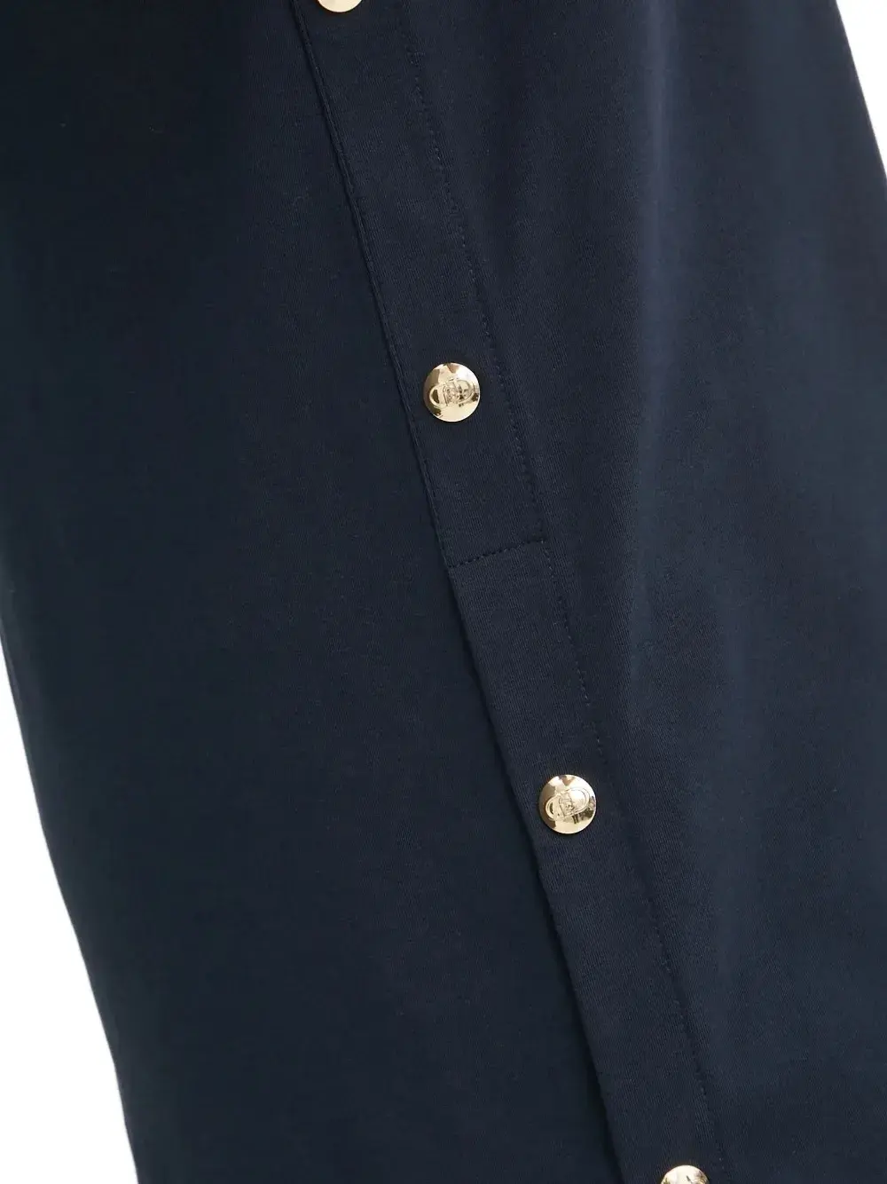 Темно-синий, короткие рукава, круглый вырез, вышитый логотип, прямой подол.