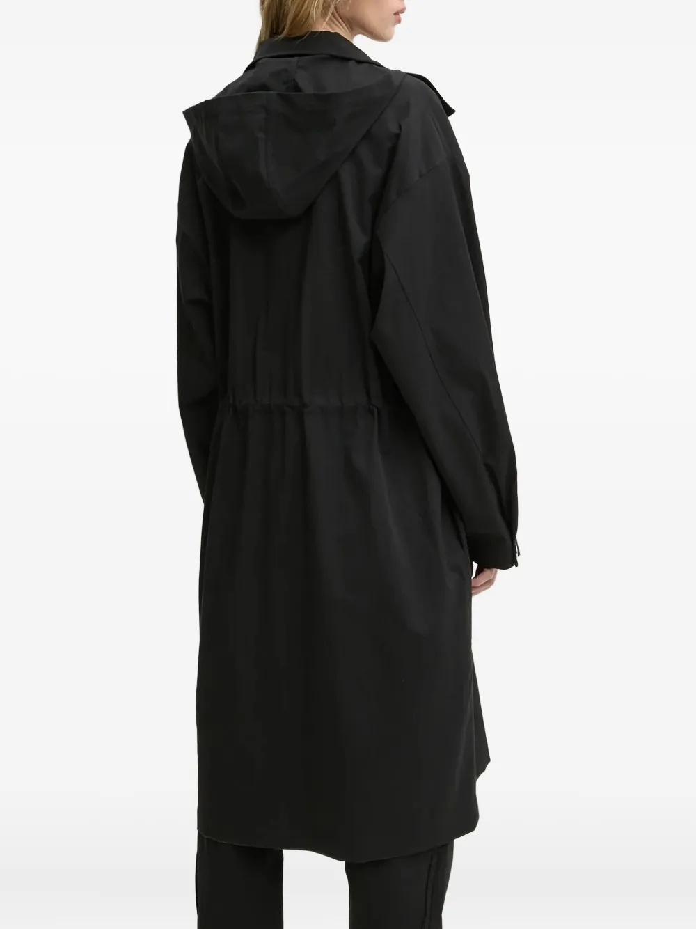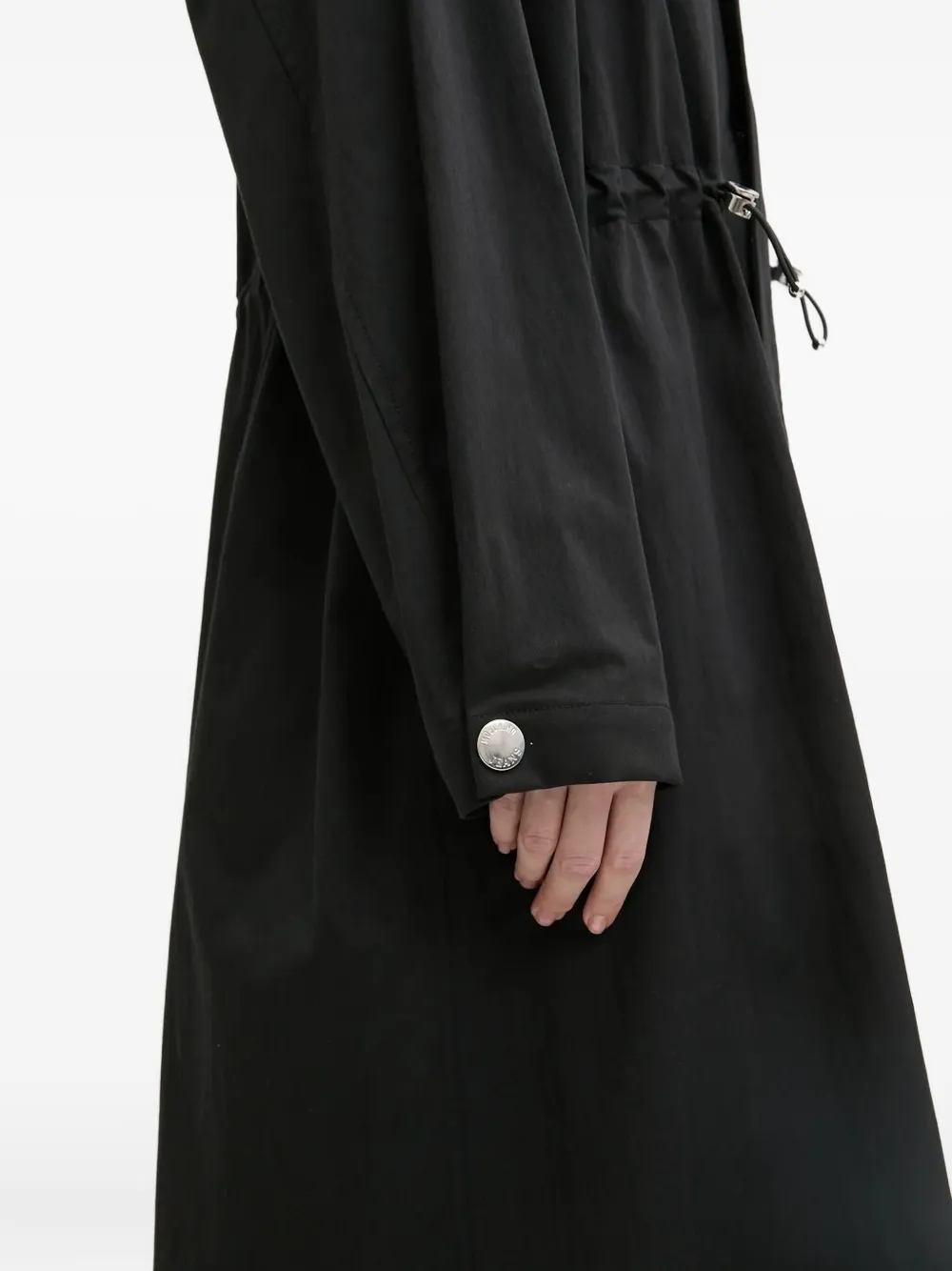 Черная завязка на талии, капюшон, вырез горловины, нашивка с логотипом, застежка на пуговицы серебристого тона, длинные рукава