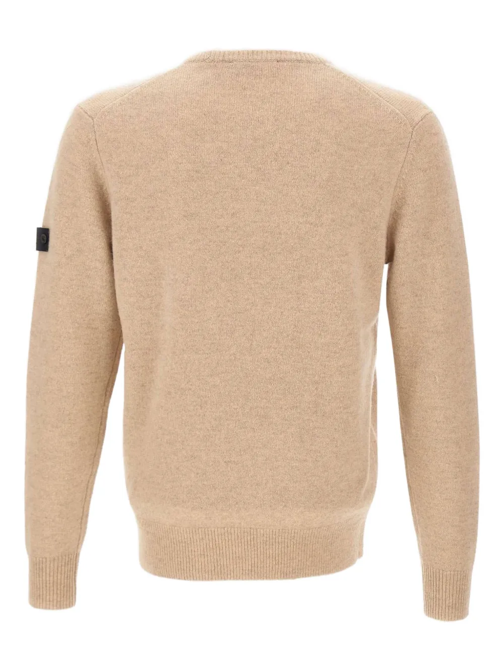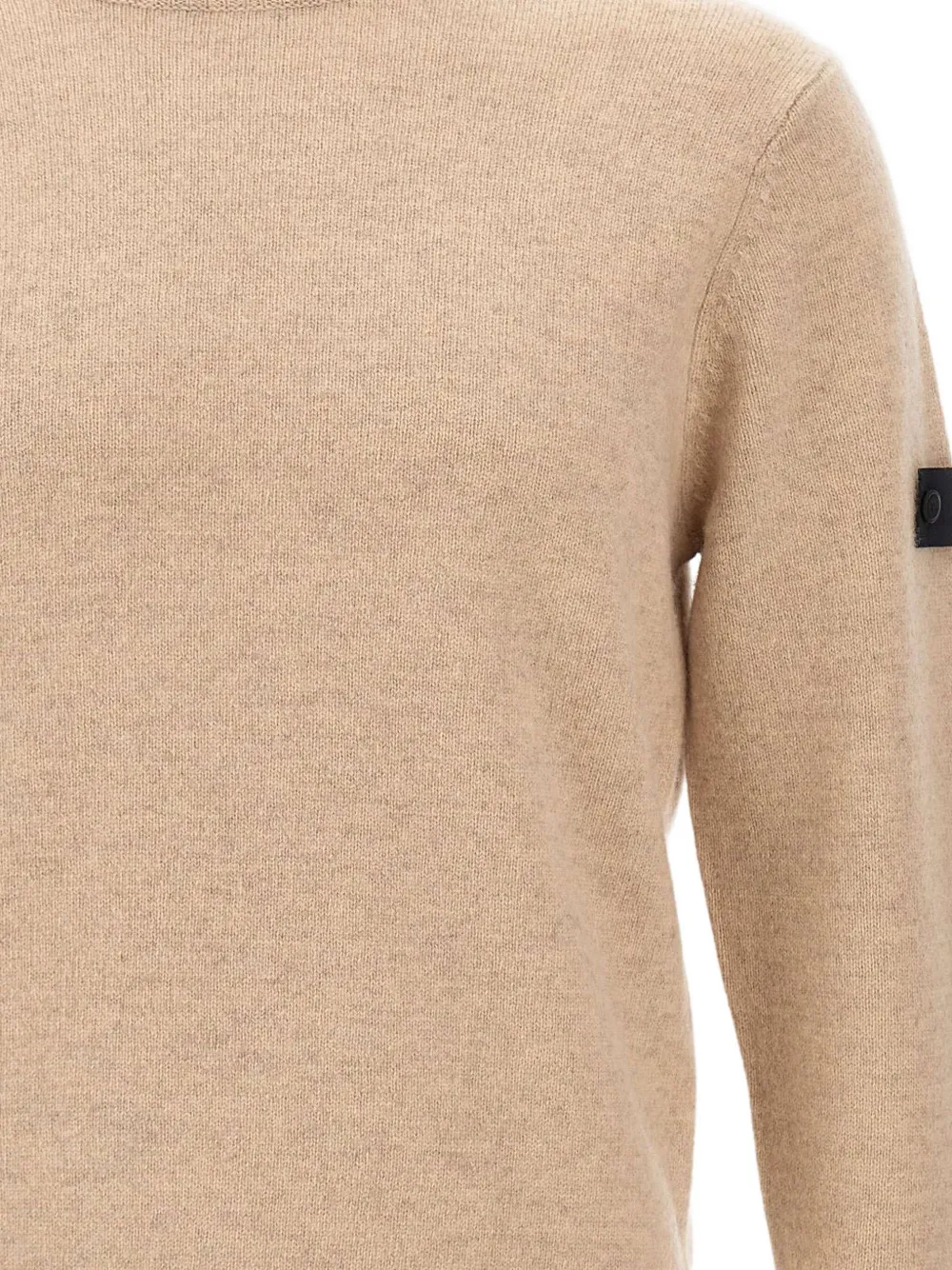 Бежевый круглый вырез горловины, длинные рукава, нашивка с логотипом, ребристый подол, ребристые манжеты.