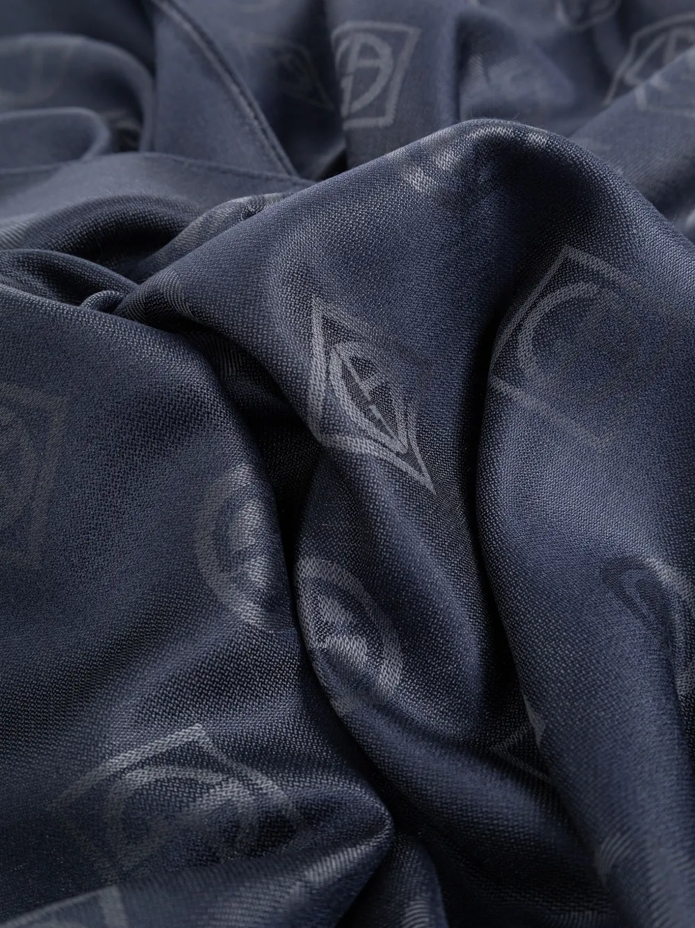 Темно-синий шелковый узор с логотипом, бахрома по краям