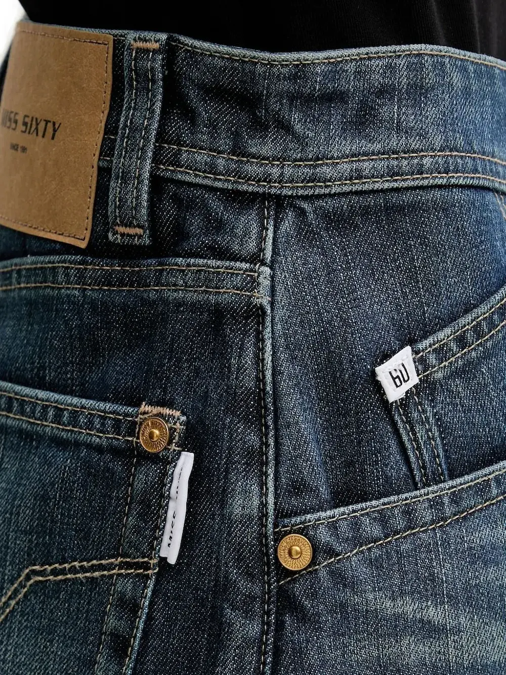 Синяя выцветшая застежка на пуговицы с логотипом и пятью карманами.